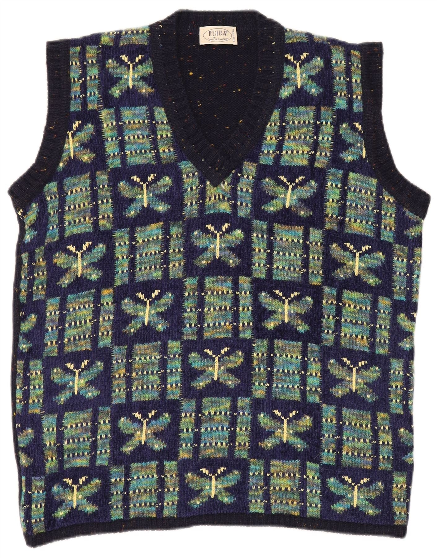 - KI-Beschreibung: Dieses Herren-Tanktop von Erika ist aus einer edlen Wollmischung mit marineblauer Basis gefertigt. Es zeigt einen auffälligen Schmetterlings-Tierdruck in Grün- und Blautönen. Der V-Ausschnitt und das ärmellose Design bieten eine klassische, bequeme Passform. Sein regelmäßiger Schnitt sorgt für ein angenehmes Tragegefühl und macht es zu einem unverwechselbaren Kleidungsstück für den Lagenlook.