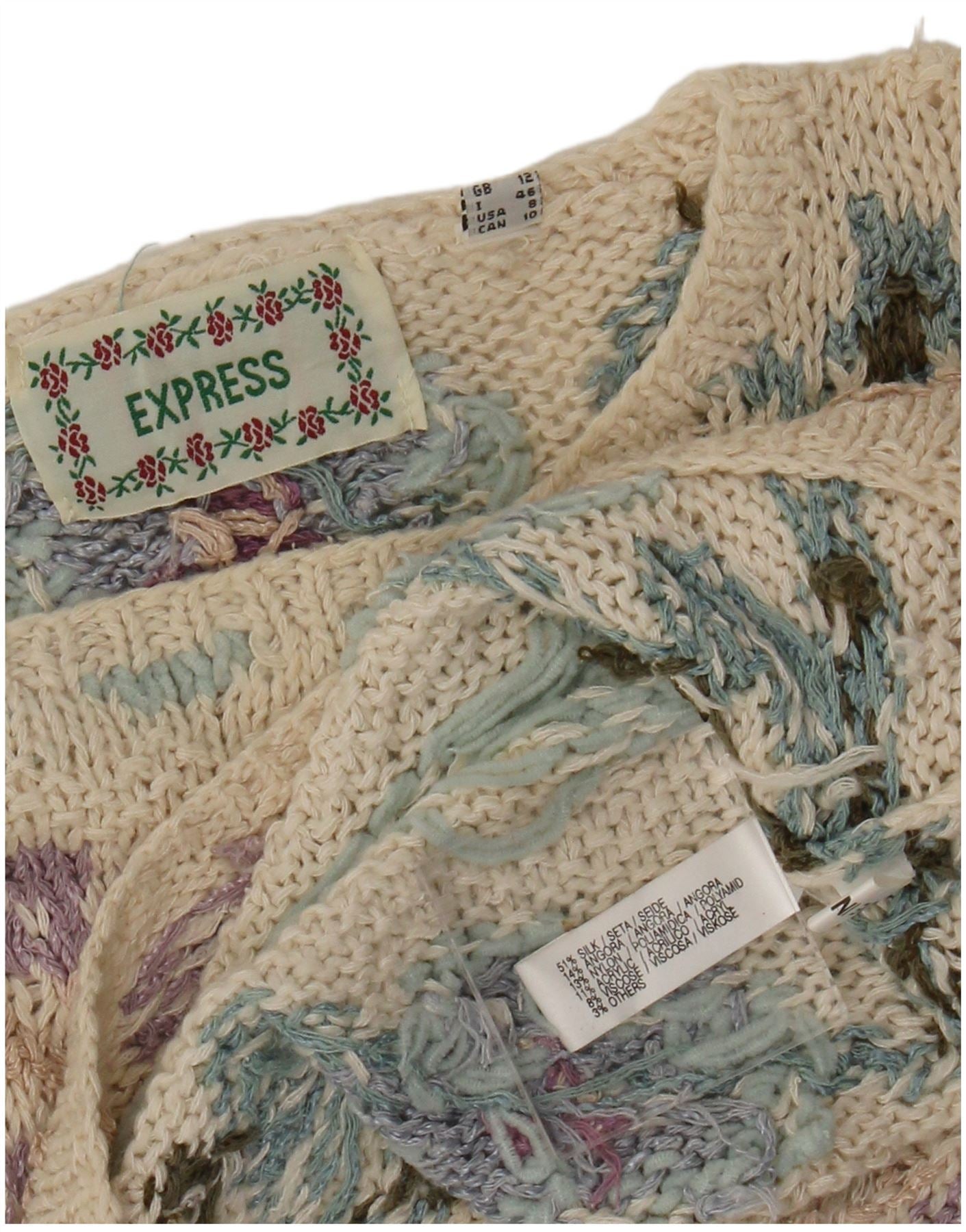 Express Damen-Pullover mit Rundhalsausschnitt, Gr. 12, mittelbeige, geblümte Seide