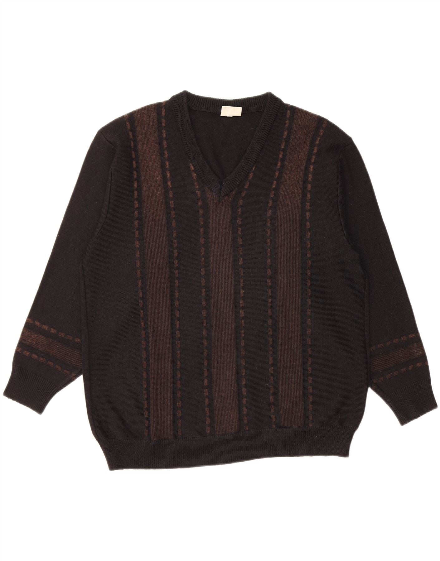 - KI-Beschreibung: Dieser Vintage-Herrenpullover mit V-Ausschnitt ist aus einer weichen Strickmischung aus Polyacryl und Wolle gefertigt. Es verfügt über eine tiefschwarze Basis mit markanten braun gestreiften geometrischen Mustern. Der V-Ausschnitt und die langen Ärmel mit Bündchen sorgen für eine klassische Silhouette. Seine reguläre Passform sorgt für angenehmen Tragekomfort. Dieses Pullover-Design kombiniert Wärme mit Retro-Stil und eignet sich perfekt für vielseitige Lagenlooks.