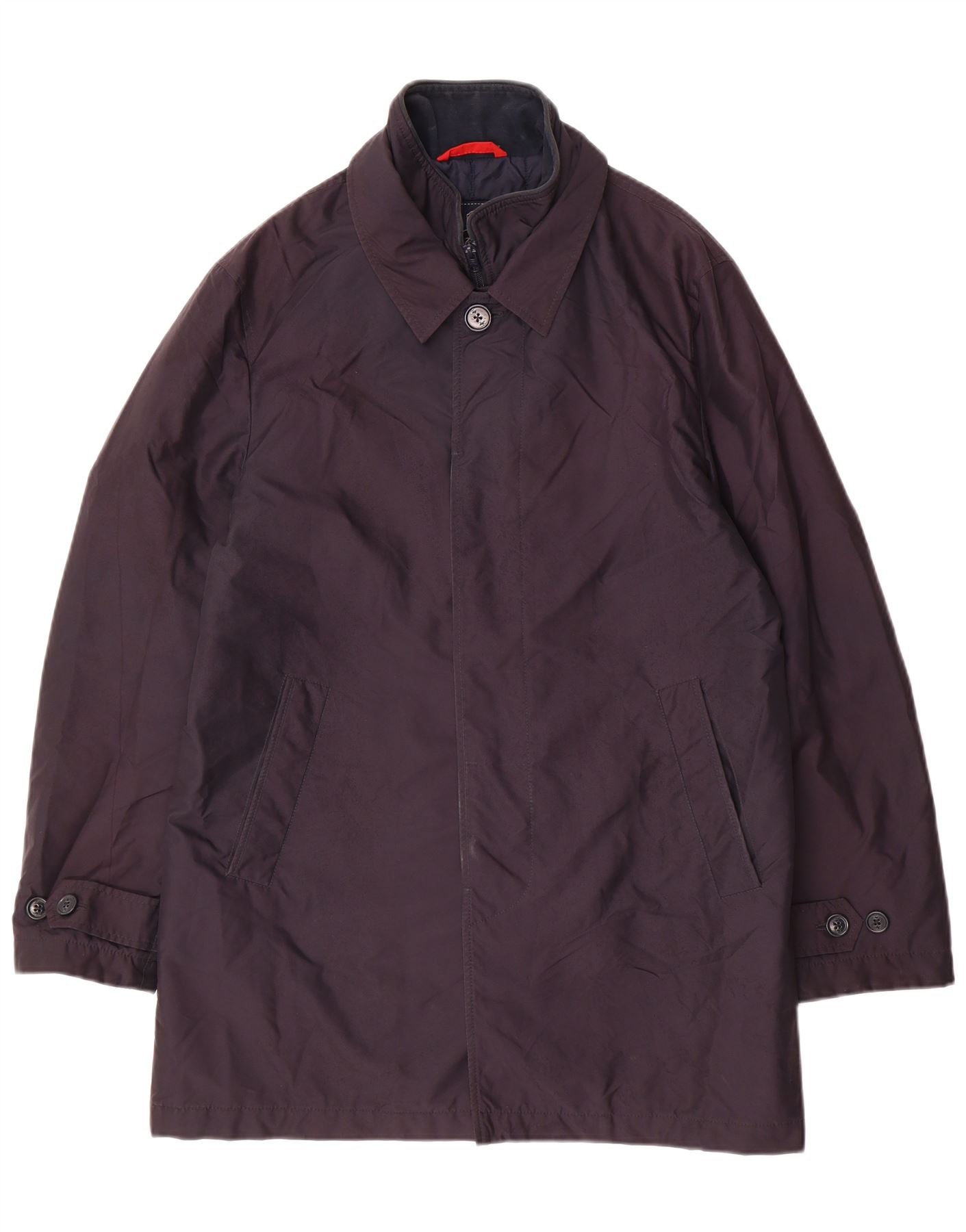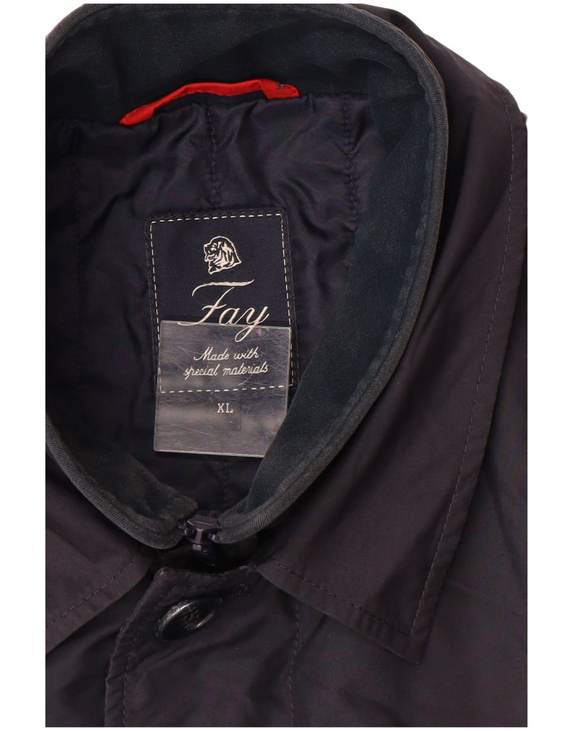 - AI Description: This Fay mens rain jacket is presented in a sophisticated navy blue woven fabric. It offers a lightweight feel. The collared neckline and long sleeves provide classic coverage. A regular fit ensures comfortable wear. It features a button and zip closure for practicality. Functional pockets add utility.