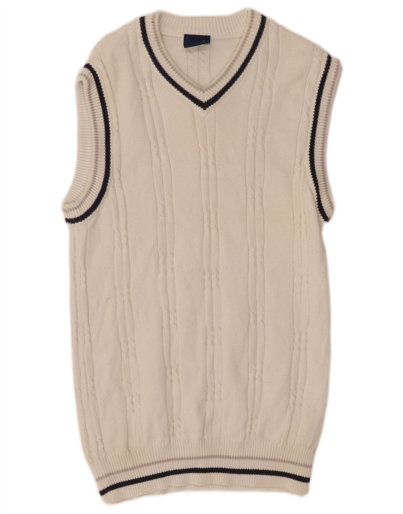 - AI Description: This Fishbone men's sweater is crafted from knitted cotton in a striped pattern. The sleeveless design and V-neck offer a preppy, casual style. Its regular fit ensures comfort and ease of movement. The pullover closure maintains a clean, streamlined look. Perfect for layering or wearing on its own.