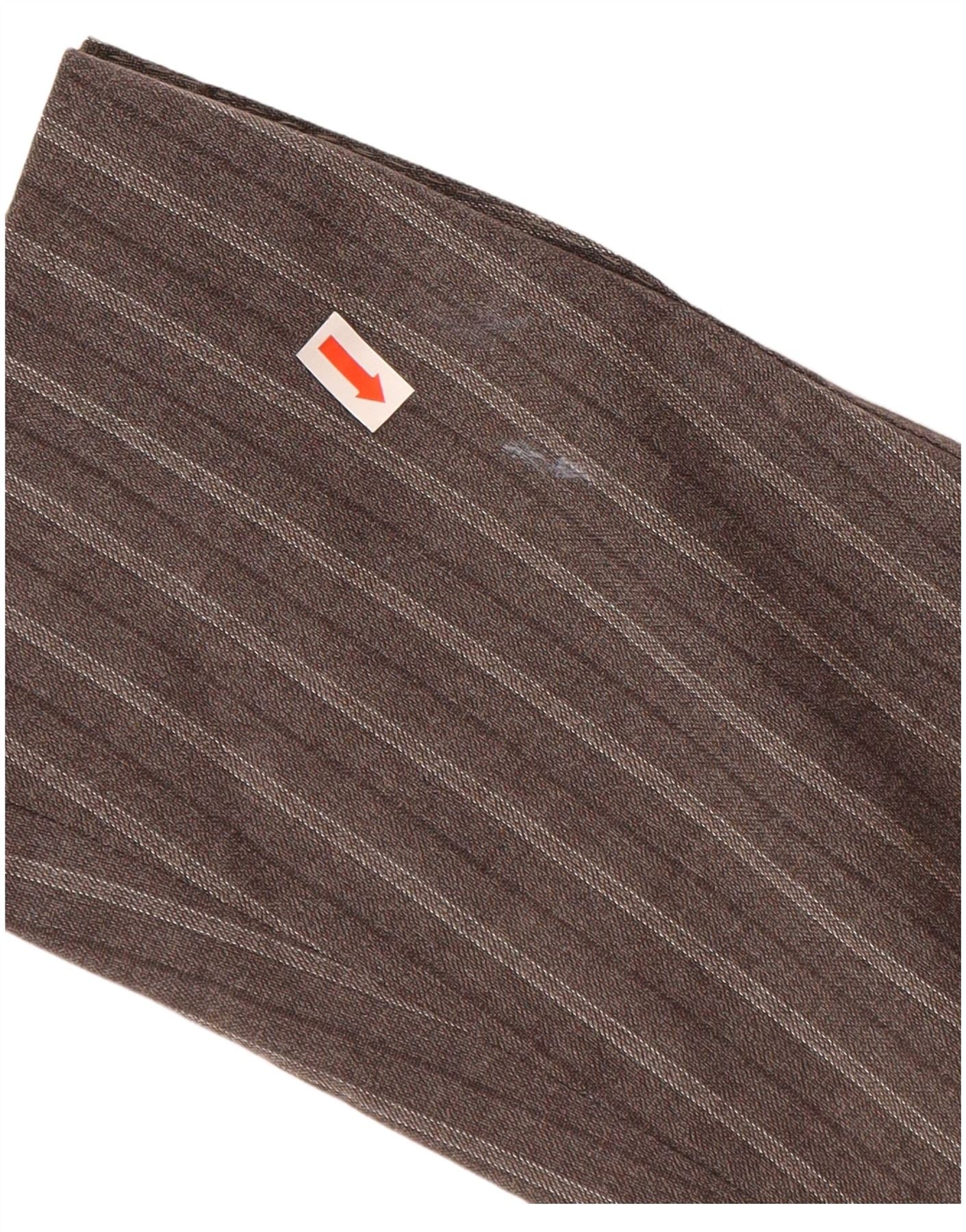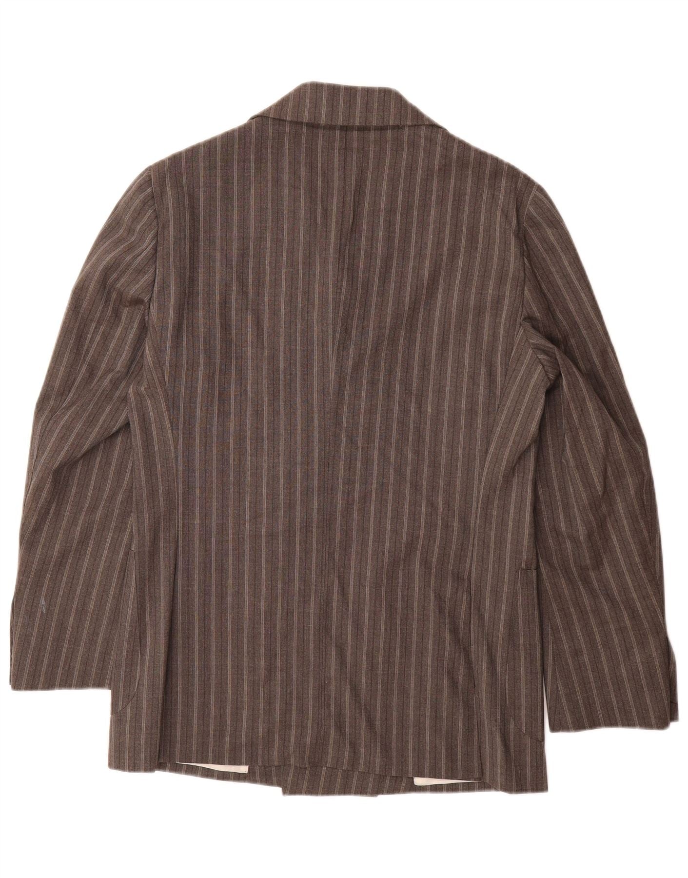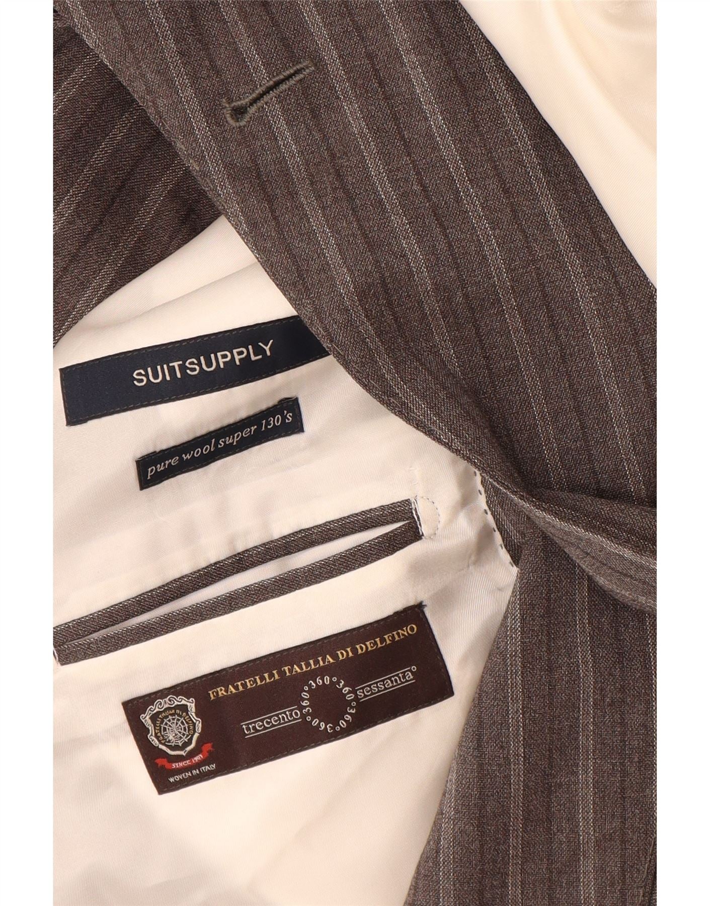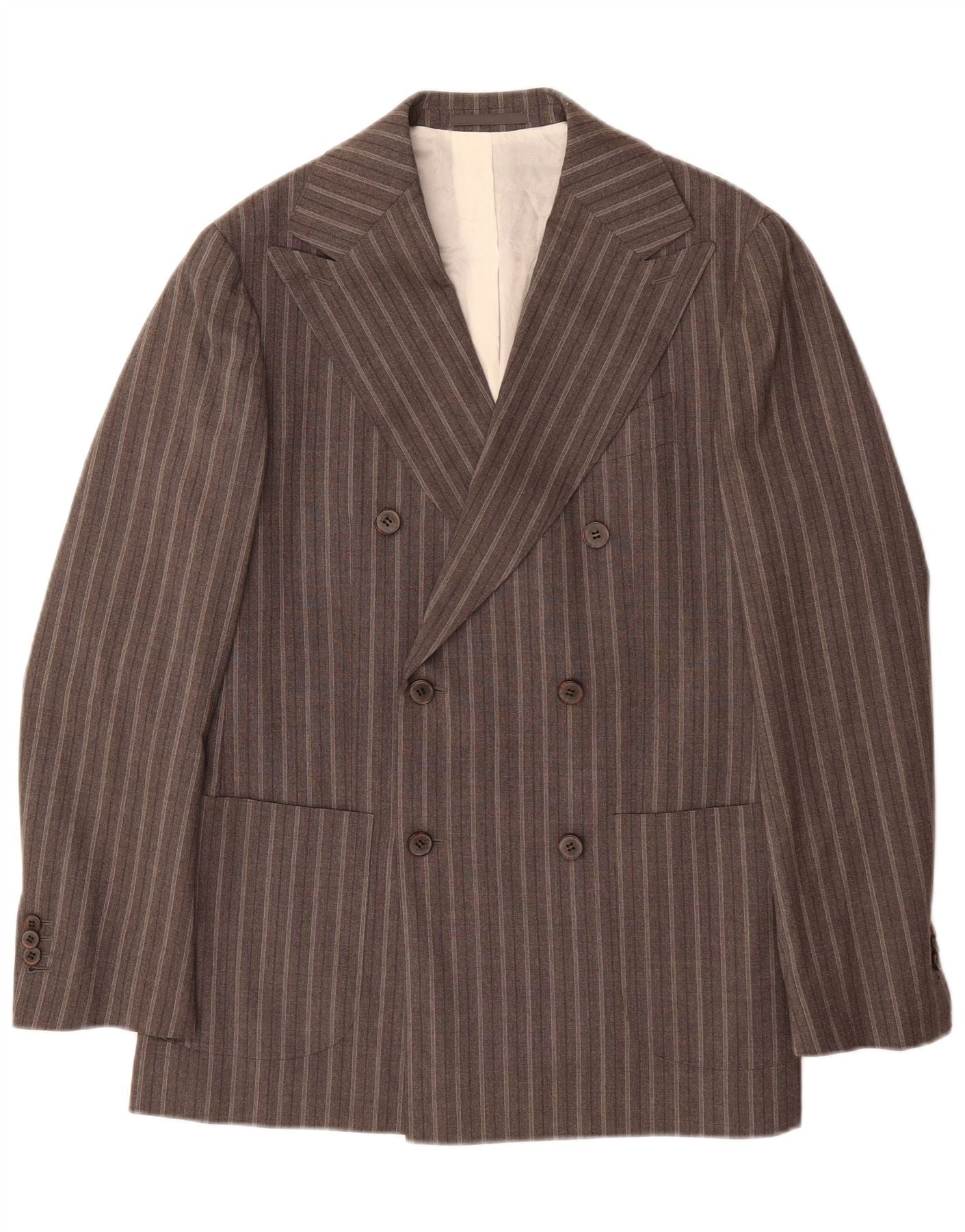 - AI Description: This Suitsupply mens 2-piece suit is crafted from luxurious 100 percent woven wool. The brown fabric features a refined pinstripe pattern. It boasts a classic fit, offering a timeless silhouette. The double-breasted jacket has a collared neckline and a six-button closure. Long sleeves complete the sophisticated design. Trousers complement the jacket perfectly. This suit is fully lined and includes practical pockets, ensuring both style and comfort.