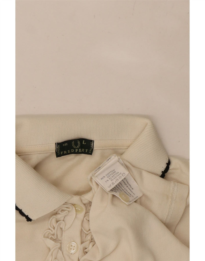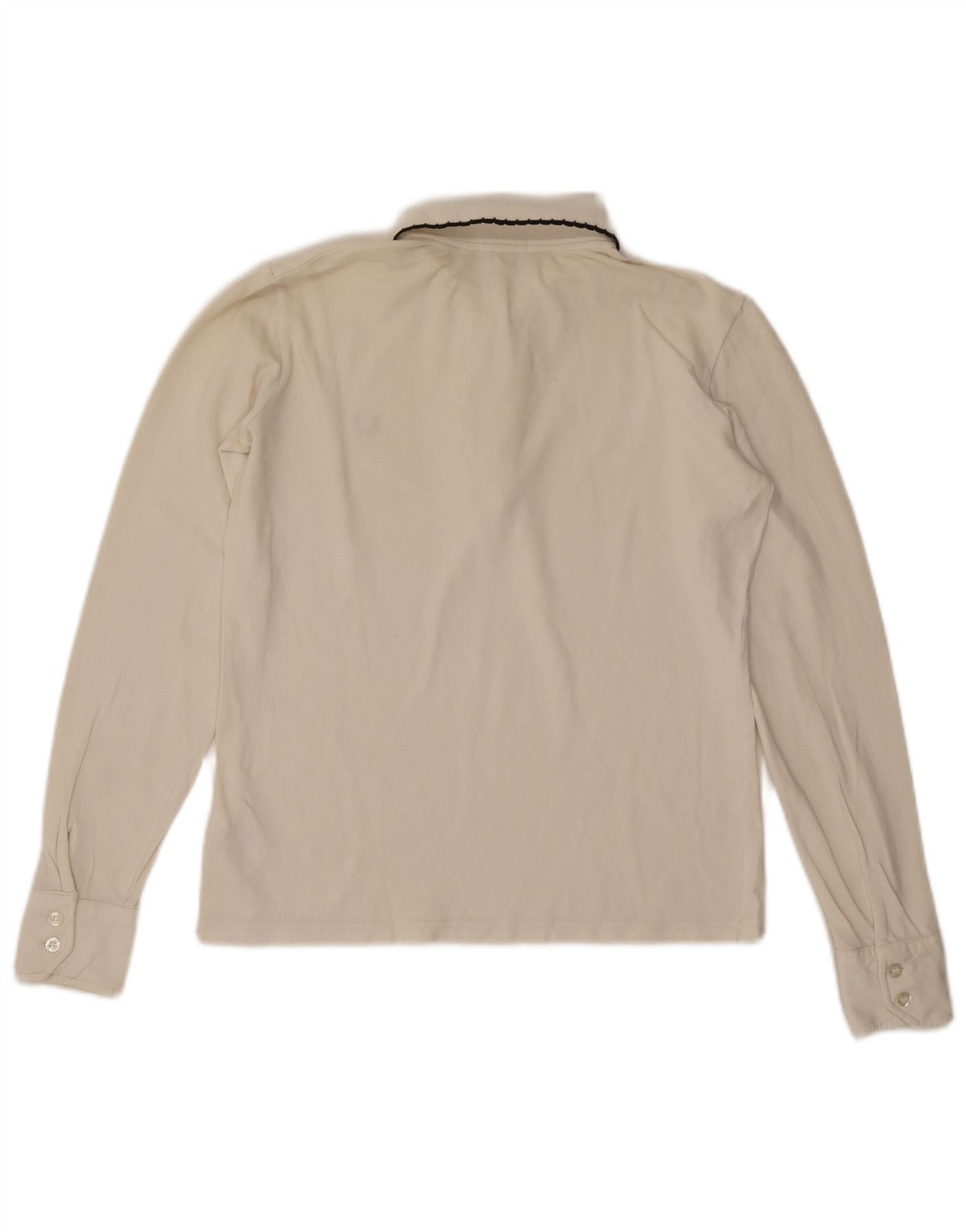 FRED PERRY Damen-Langarm-Poloshirt mit Rüschen vorne, UK 14, Größe L, Weiß