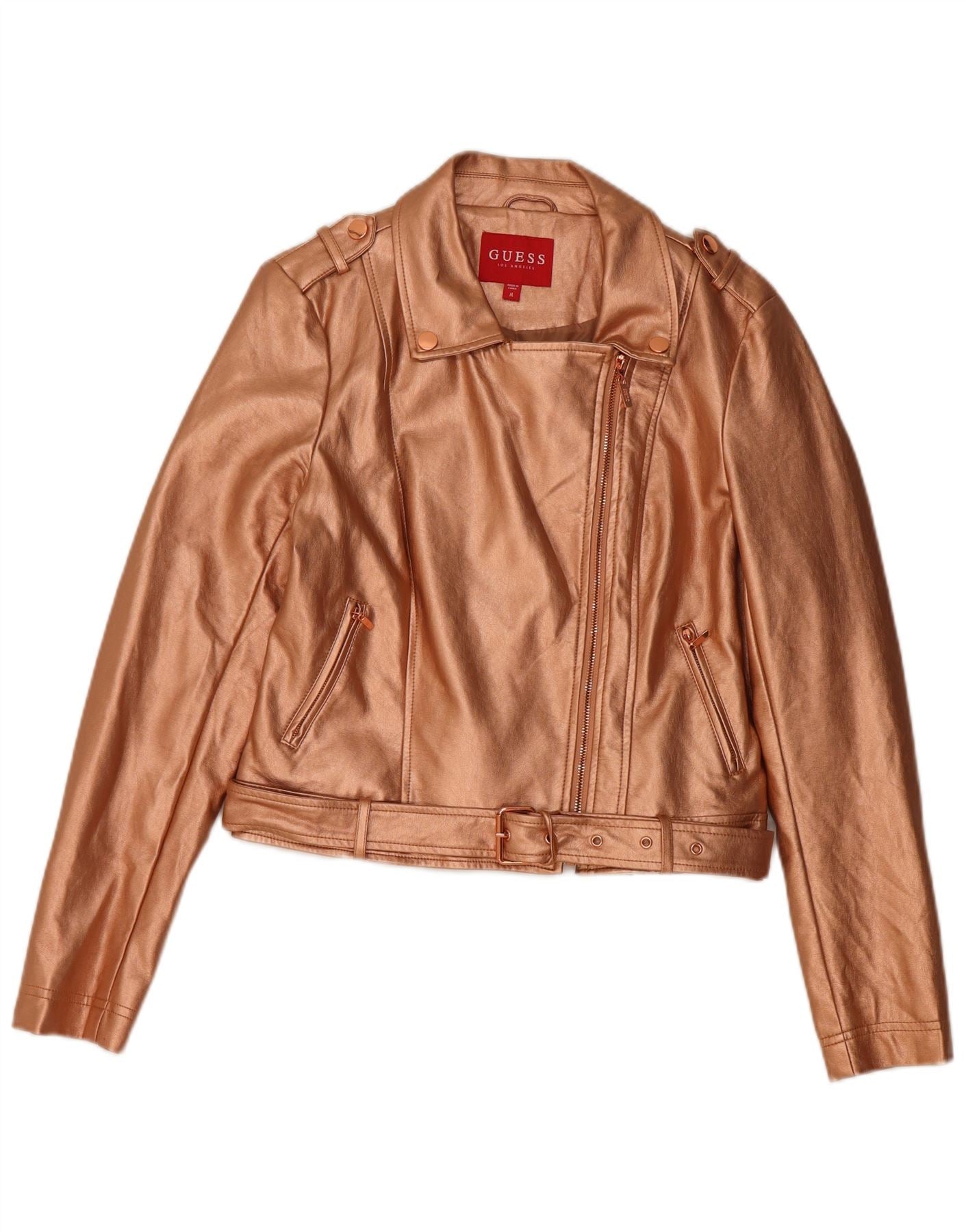 GUESS Damen Crop Kunstleder Bikerjacke UK 12 Medium Gold Polyurethan