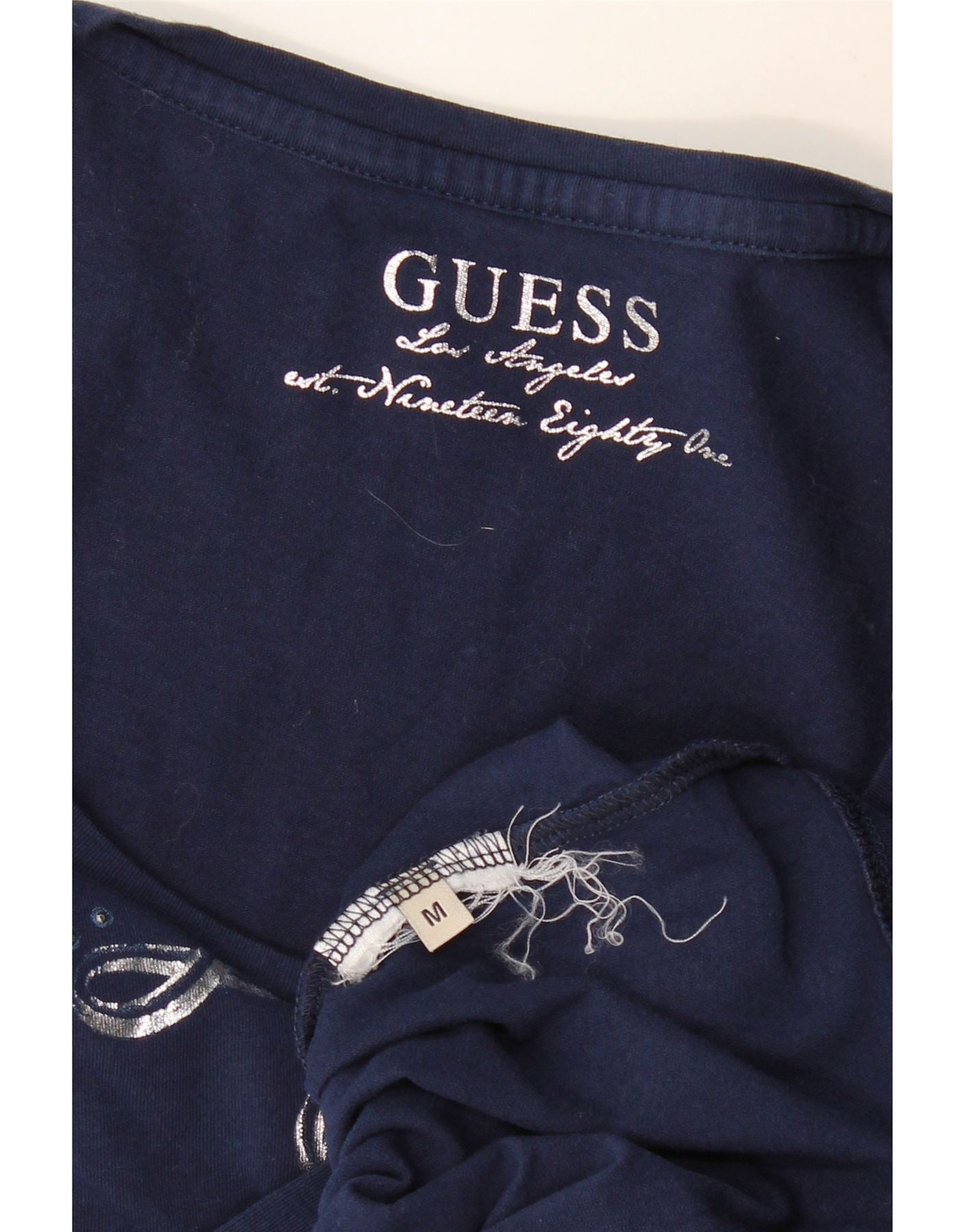- KI-Beschreibung: Dieses grafische T-Shirt-Oberteil für Damen von Guess ist aus weichem marineblauem Jerseystoff gefertigt. Es verfügt über einen klassischen Rundhalsausschnitt und kurze Ärmel. Die reguläre Passform sorgt für angenehmen Tragekomfort. Eine markante Guess Los Angeles California 1981-Grafik ziert die Vorderseite und verleiht ihm einen charakteristischen Touch. Dieser Pulloverstil bietet mühelosen Casual-Appeal.