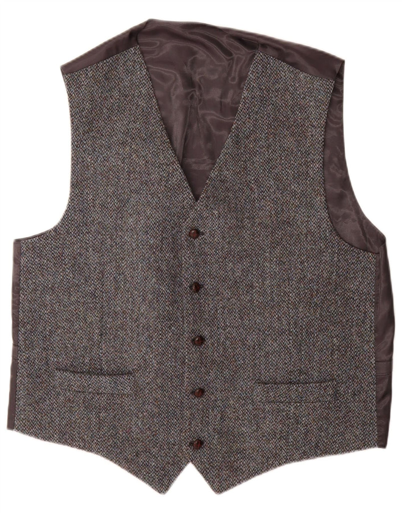 - AI Description: This Harris Tweed mens waistcoat is crafted from 100 percent Pure New Wool tweed. The fabric has a rich, flecked texture in grey. It features a classic V-neckline and a sleeveless design. The heritage fit offers a timeless silhouette. A five-button front closure provides a traditional look. Practical pockets and an adjustable waist enhance functionality. The flecked pattern adds depth and character to this classic piece.