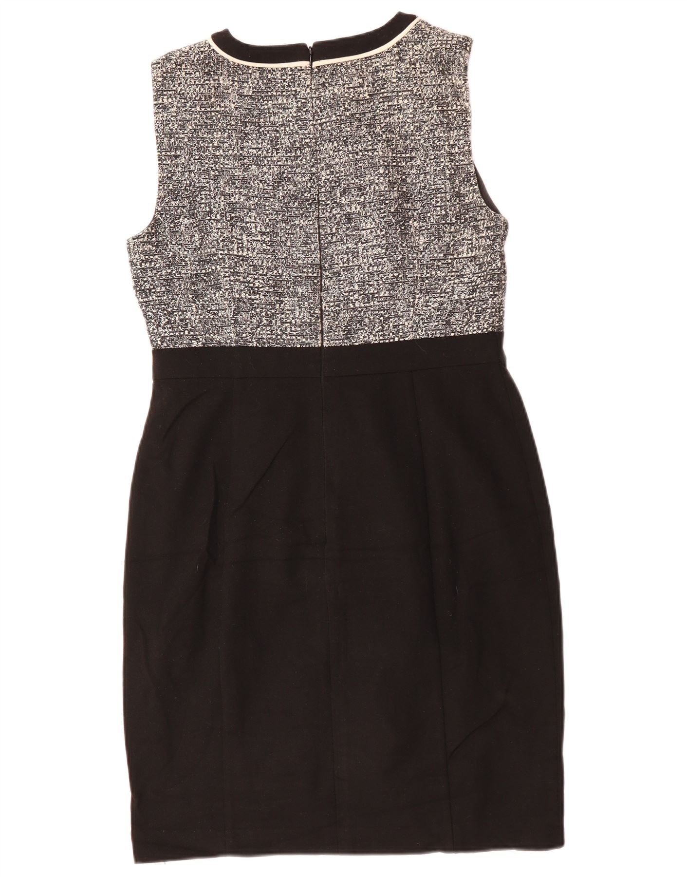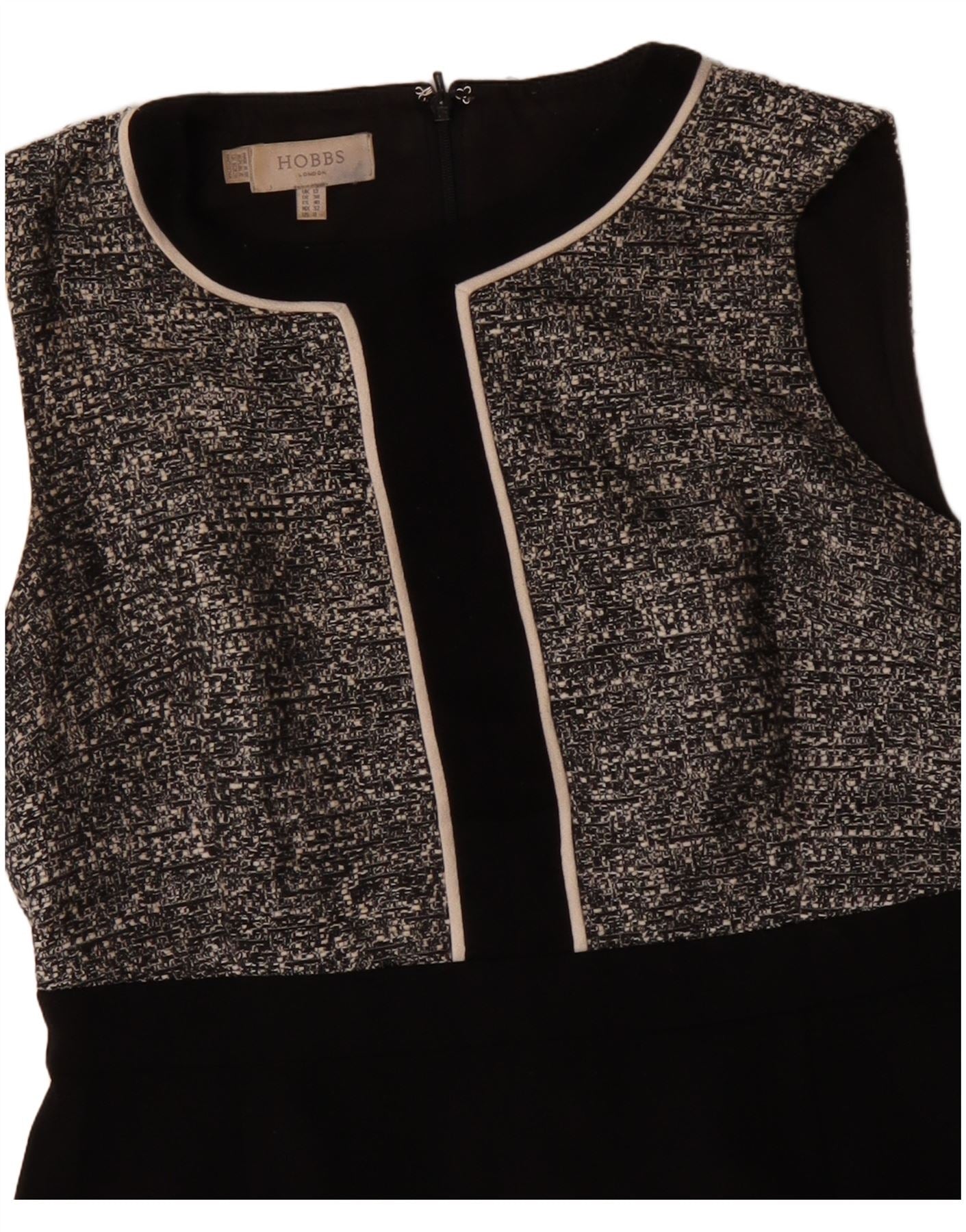 - KI-Beschreibung: Dieses Etuikleid für Damen von Hobbs verfügt über ein raffiniertes Oberteil aus schwarz-weiß gesprenkeltem Tweed. Der untere Rock ist aus glattem schwarzem Stoff gefertigt. Es hat einen klassischen Rundhalsausschnitt und einen ärmellosen Schnitt. Ein kontrastierender Besatz umrahmt den Ausschnitt und die Mittelbahn. Die reguläre Passform bietet eine schmeichelhafte Silhouette. Das gesprenkelte Muster auf dem Oberteil sorgt für interessante Struktur. Ein hinterer Reißverschluss sorgt für einen ordentlichen Abschluss.