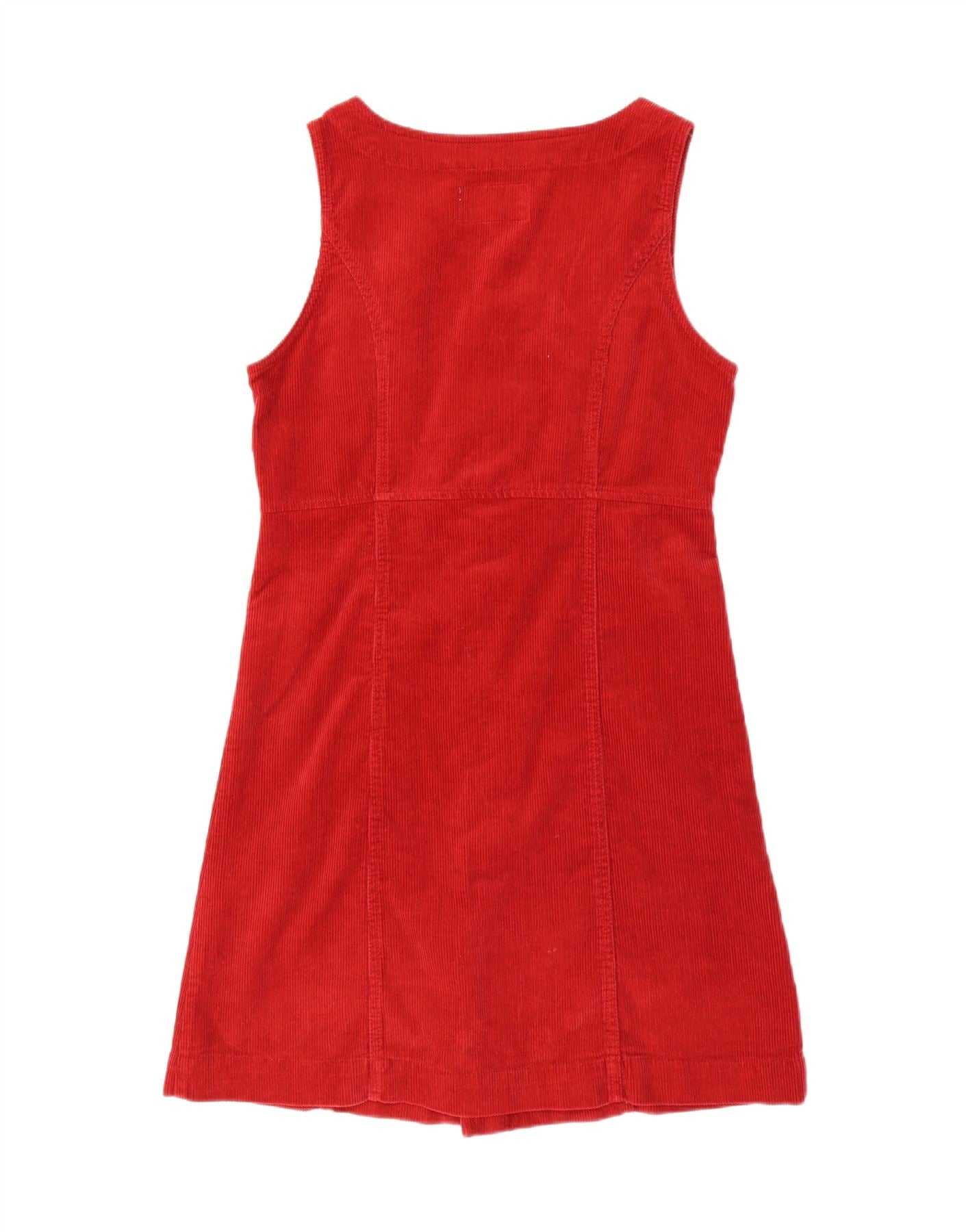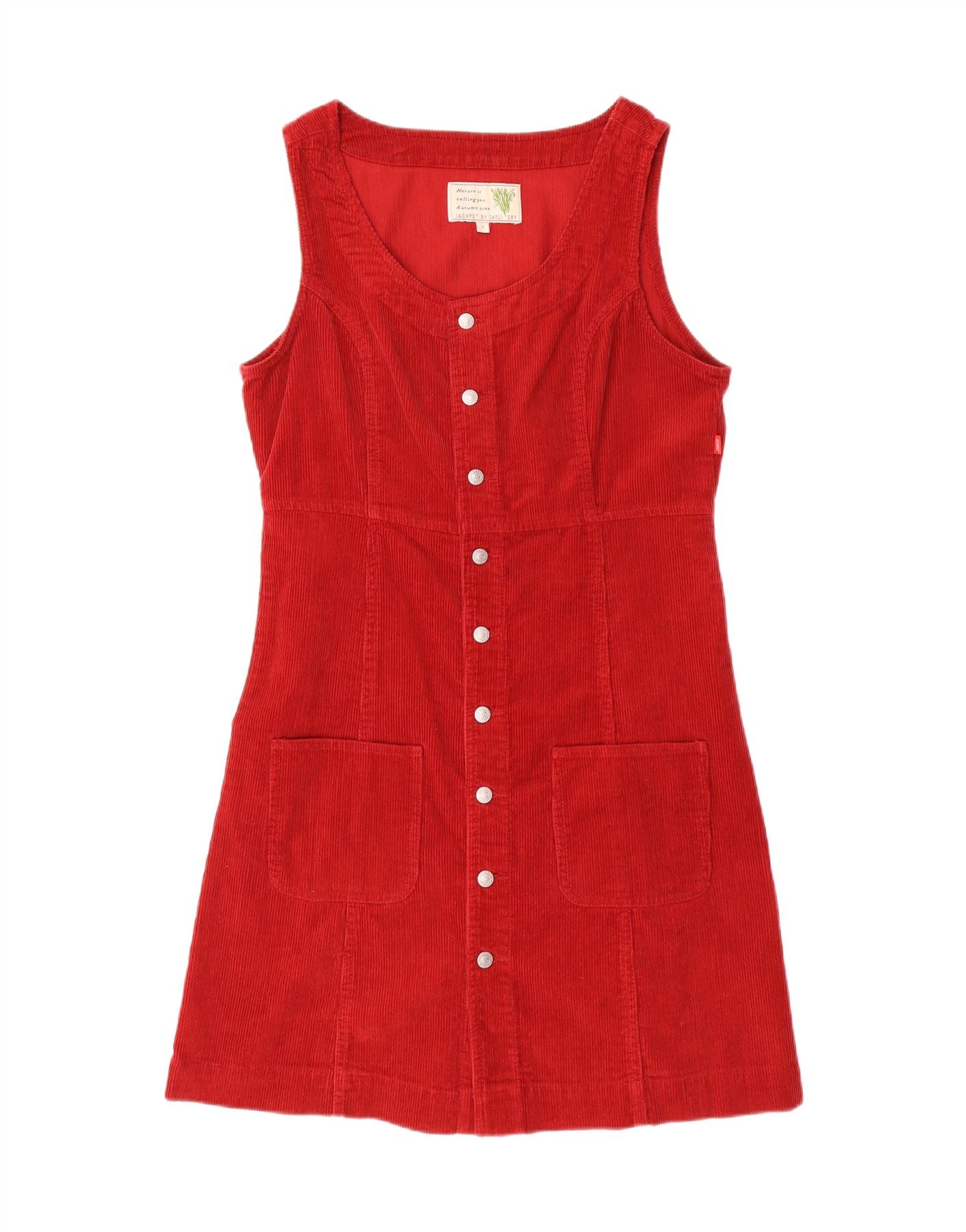 - AI Description: This Vintage women’s A-line dress is crafted from rich red corduroy, offering a soft, tactile finish. The sleeveless design features a classic round neck, providing a clean silhouette. A full button-up front adds vintage charm, complemented by practical pockets. The A-line cut ensures a comfortable regular fit, embracing a timeless retro aesthetic. Its pure cotton composition ensures breathability and comfort for everyday wear. The durable corduroy fabric gives it a distinctive, heritage feel.