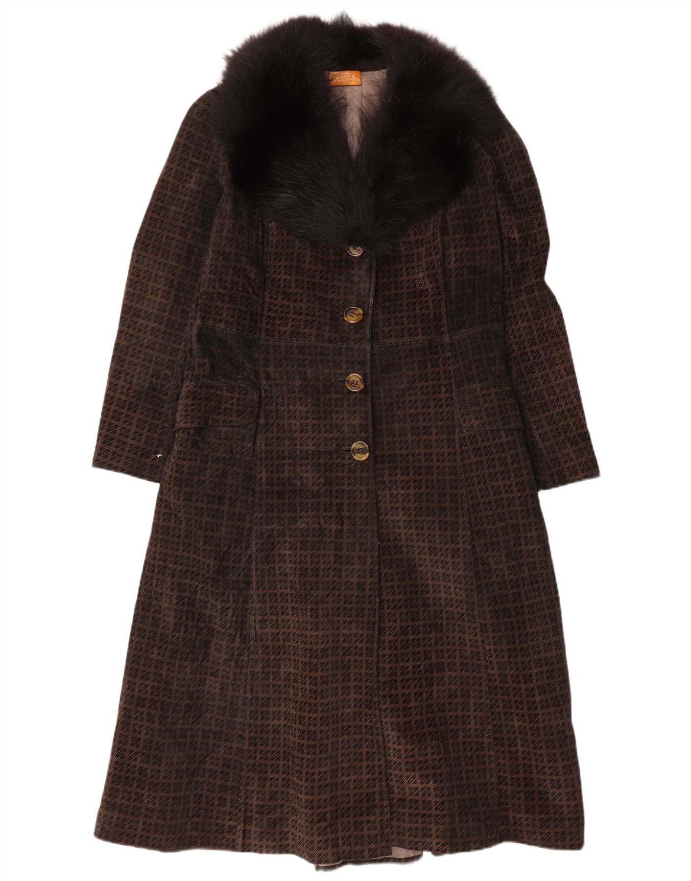 - KI-Beschreibung: Dieser Damenmantel von Lesy ist aus braunem Cord gefertigt und weist ein dezentes geometrisches Muster auf. Es verfügt über einen luxuriösen schwarzen Kunstpelzkragen. Die lange Silhouette bietet eine normale Passform mit Kragenausschnitt und langen Ärmeln. Ton-in-Ton-Knopfverschlüsse sichern die Vorderseite. Praktische Taschen sind in das Design integriert. Für mehr Komfort ist der Mantel vollständig gefüttert.