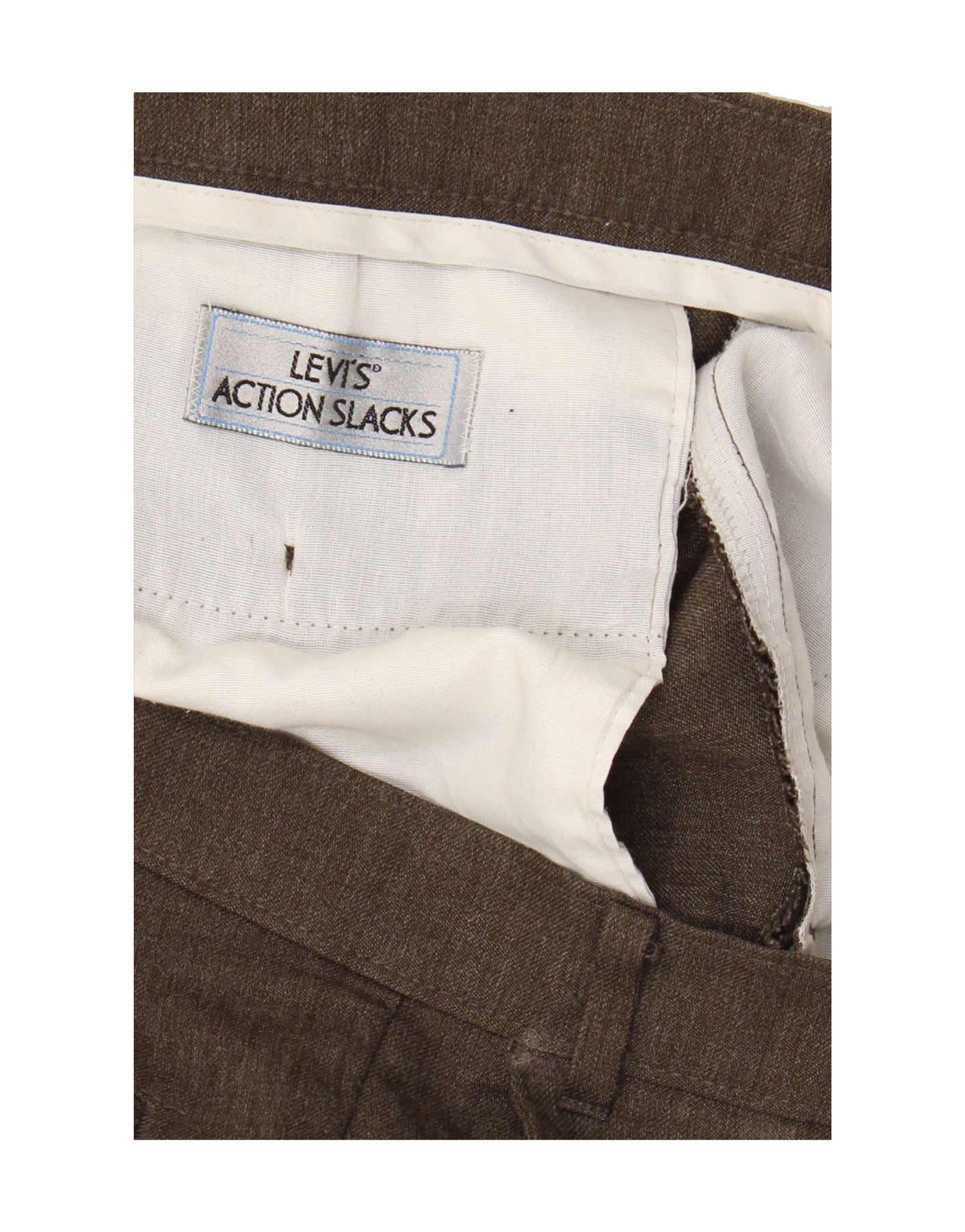 - AI Description: Levi's presents these pre-owned men's trousers, crafted from 100% polyester in a versatile brown hue. The woven fabric offers a regular fit, complemented by a button closure and classic style. These trousers feature practical pockets and a button accent, with potential for pleated, buckled, or logo detailing. A minor loose stitching defect is noted on the inner lining. Labelled size W48 L30 with care instructions on the reverse. Made in the U.S.A.