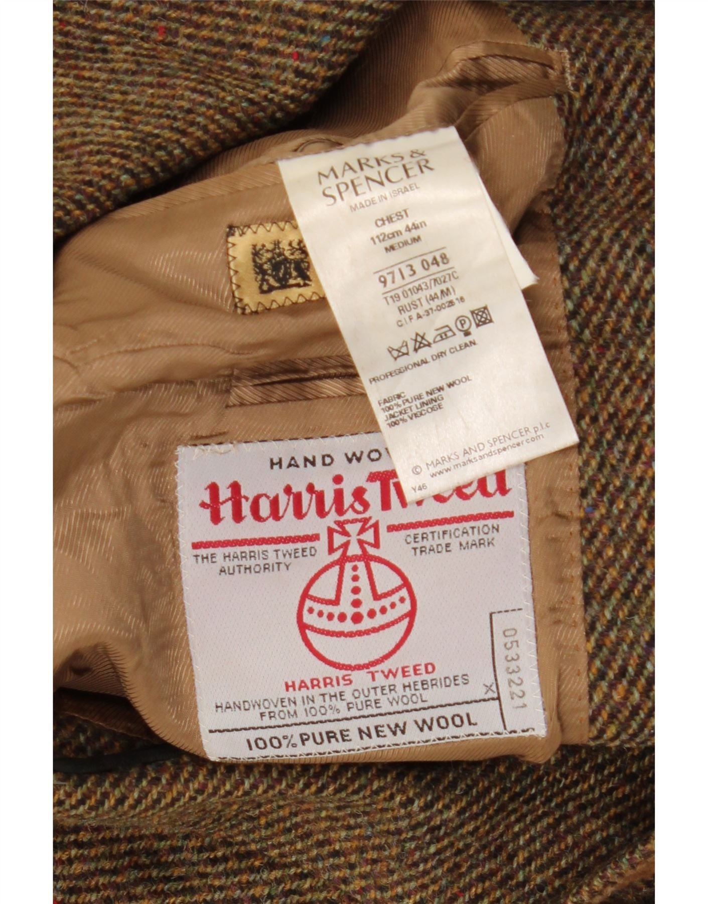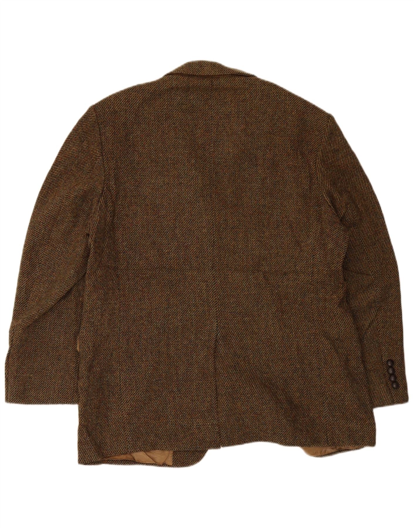 - AI Description: This Marks & Spencer mens Blazer Jacket is crafted from rich Harris Tweed pure new wool. Its flecked brown weave offers a distinctive texture. The classic fit features a collared neckline and long sleeves. A three-button closure secures the front. It is fully lined for comfort and structure. Practical pockets complete the design. This timeless piece exudes sophisticated British style.