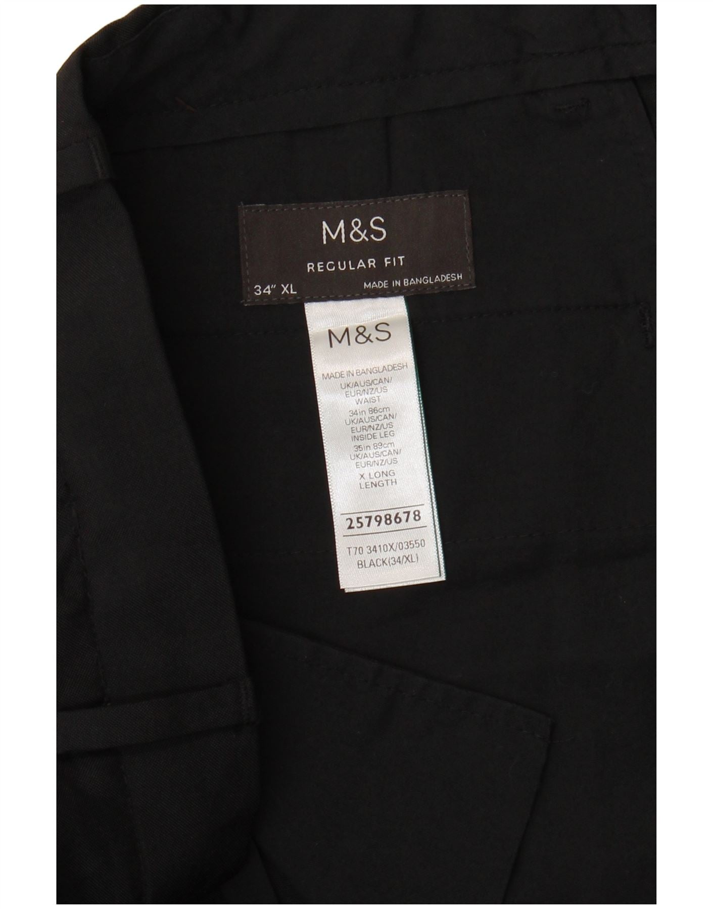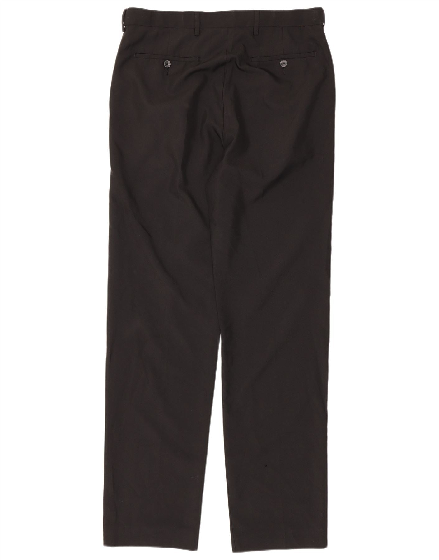 - AI Description: These Marks & Spencer men's trousers are crafted from a classic black woven fabric. They feature a regular fit, offering comfortable wear for everyday occasions. The button closure provides a secure fastening at the waist. Designed in a timeless, classic style, these trousers include practical pockets for essential items. Their clean lines and versatile black colour make them a wardrobe staple.