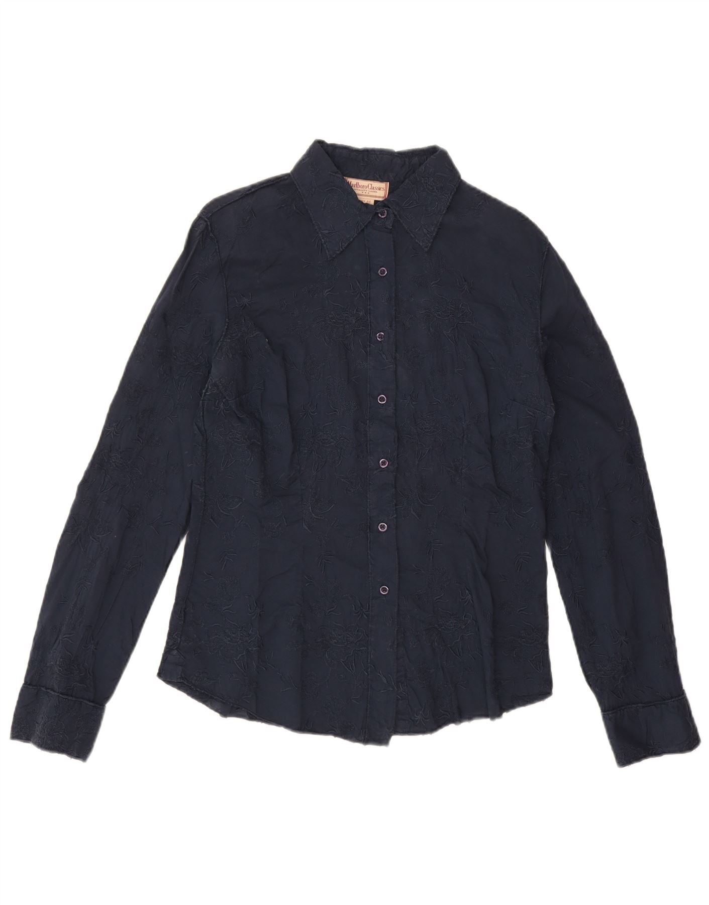 - KI-Beschreibung: Dieses Damenhemd von Marlboro Classics ist aus einem marineblauen Webstoff gefertigt. Es verfügt über einen Kragenausschnitt und eine durchgehende Knopfleiste vorne. Die langen Ärmel werden durch hübsche geknöpfte Manschetten abgerundet. Die reguläre Passform bietet angenehmen Tragekomfort. Dezente gestickte Blumenmuster zieren den Stoff und sorgen für eine zarte Textur und optisches Interesse. Dieses Stück kombiniert klassische Schneiderkunst mit einem raffinierten, femininen Touch.