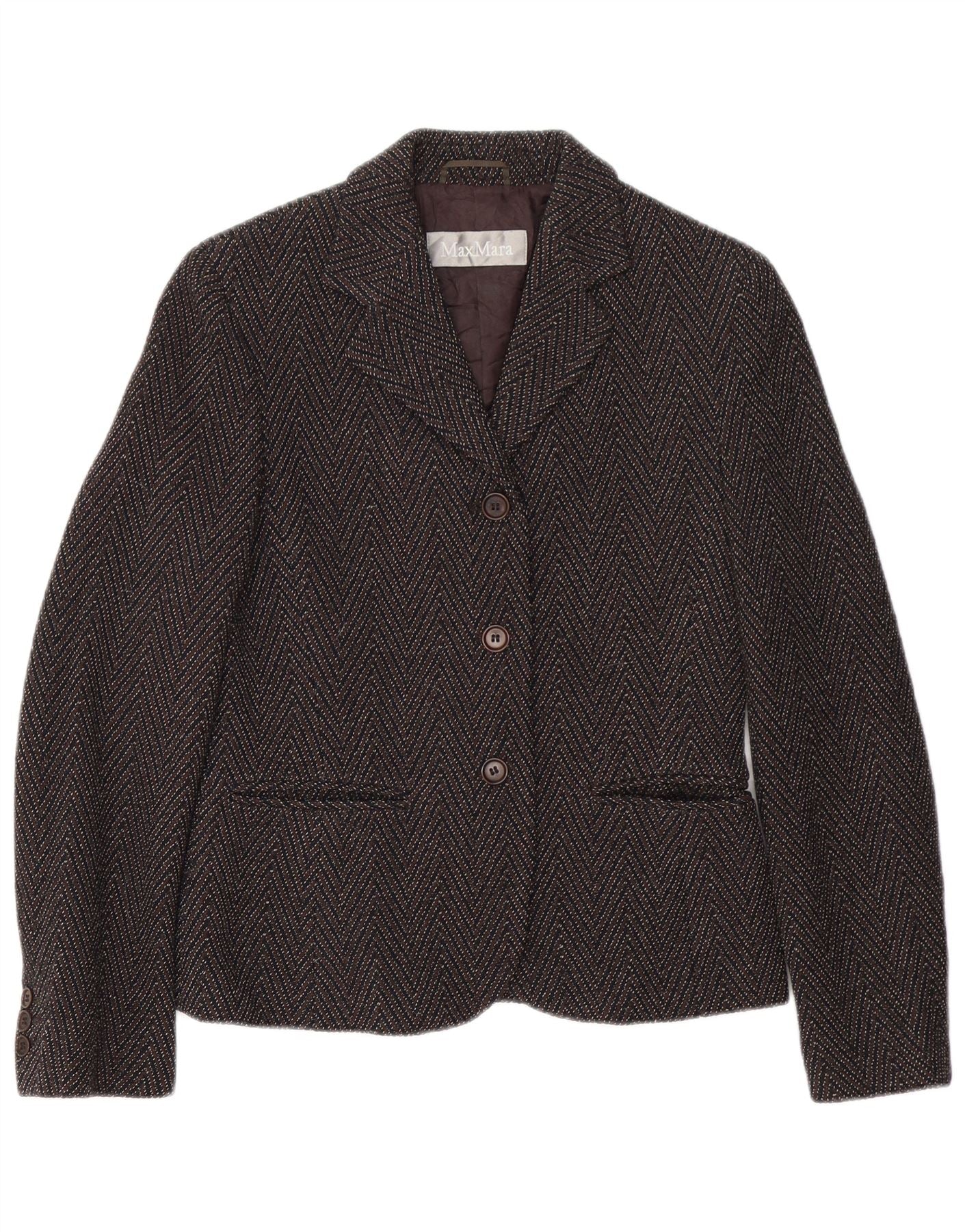 Max Mara Damen-Blazerjacke mit 3 Knöpfen, Gr. 8, Braun, Chevron-Wolle