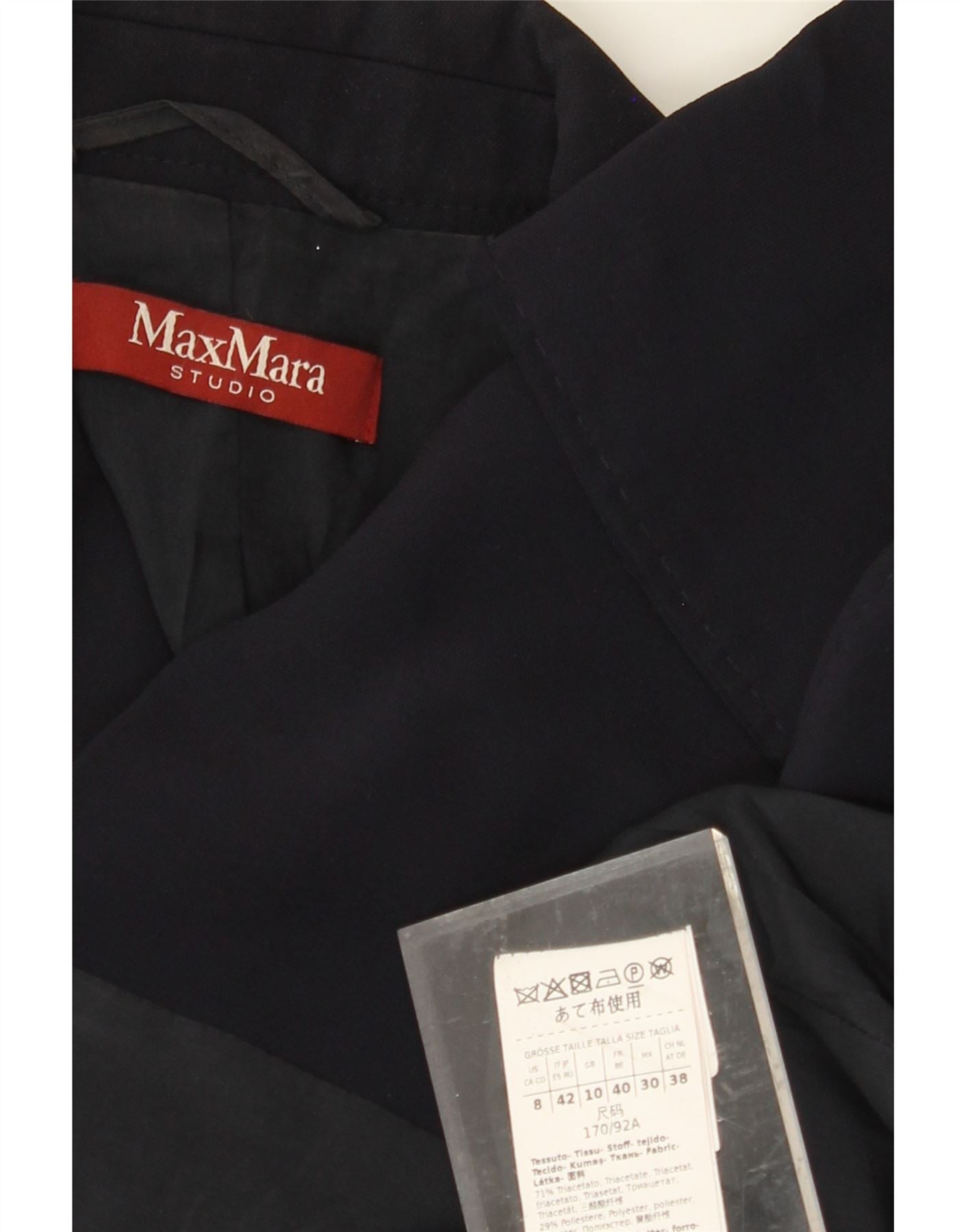 - AI Description: This Max Mara womens navy blue double breasted blazer jacket is expertly crafted from a luxurious triacetate blend. The woven fabric provides a smooth, refined texture. It features a classic collared neckline and a sophisticated double breasted button closure. Long sleeves and a regular fit ensure a comfortable and elegant silhouette. Functional pockets complete this timeless design.