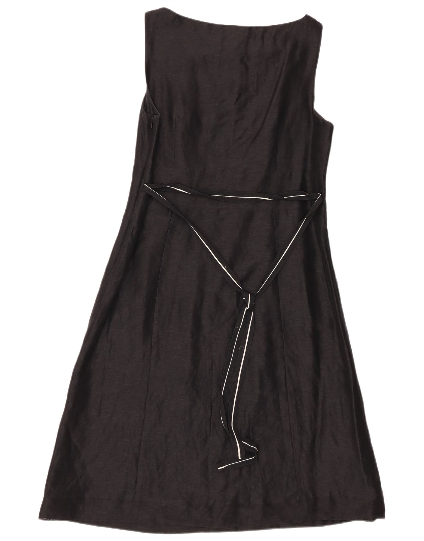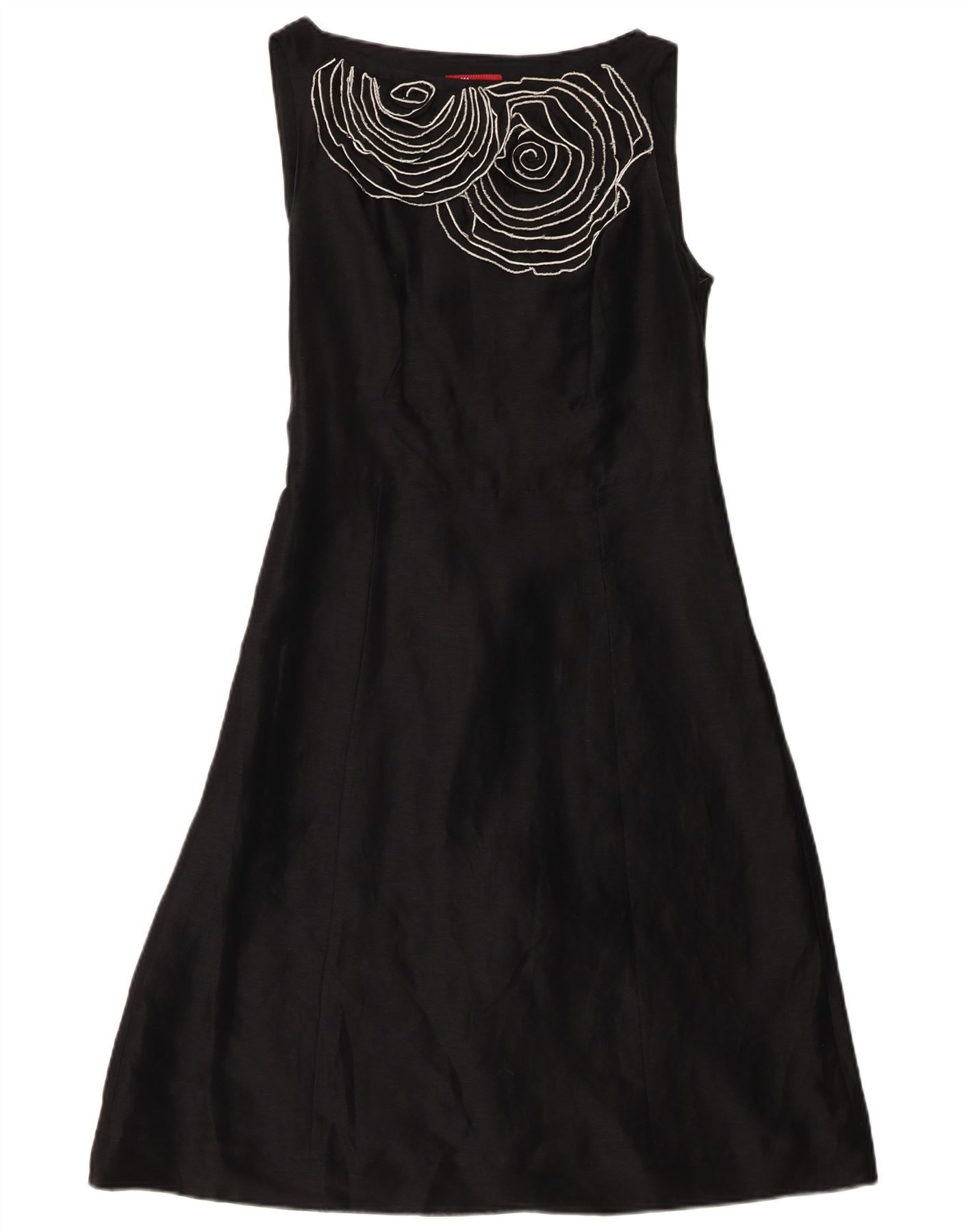 - KI-Beschreibung: Dieses A-Linien-Damenkleid von Monsoon ist aus einer luxuriösen schwarzen Leinen- und Seidenmischung gefertigt. Es verfügt über einen klassischen Rundhalsausschnitt und einen eleganten ärmellosen Schnitt. Das Oberteil ist mit einem eleganten, gestickten abstrakten Muster in Weiß verziert. Die normale Passform geht sanft in einen A-Linien-Rock über und bietet eine anmutige Silhouette. Das Kleid ist vollständig gefüttert und verfügt über einen dezenten Gürtel zur Definition der Taille. Ein dezenter Reißverschluss sorgt für einen glatten Abschluss.