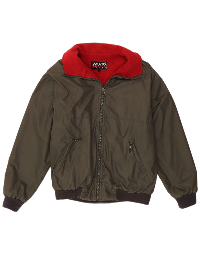 - AI Description: This Musto mens bomber jacket is crafted from durable khaki polyester with a water resistant polyurethane coating. It features a smooth woven texture and a comfortable polyester lining. The collared neckline and long sleeves offer classic bomber styling. A full zip closure secures the front. Zipped pockets provide practical storage. The regular fit ensures comfortable wear. Its clean design is free from patterns, focusing on functional elegance.