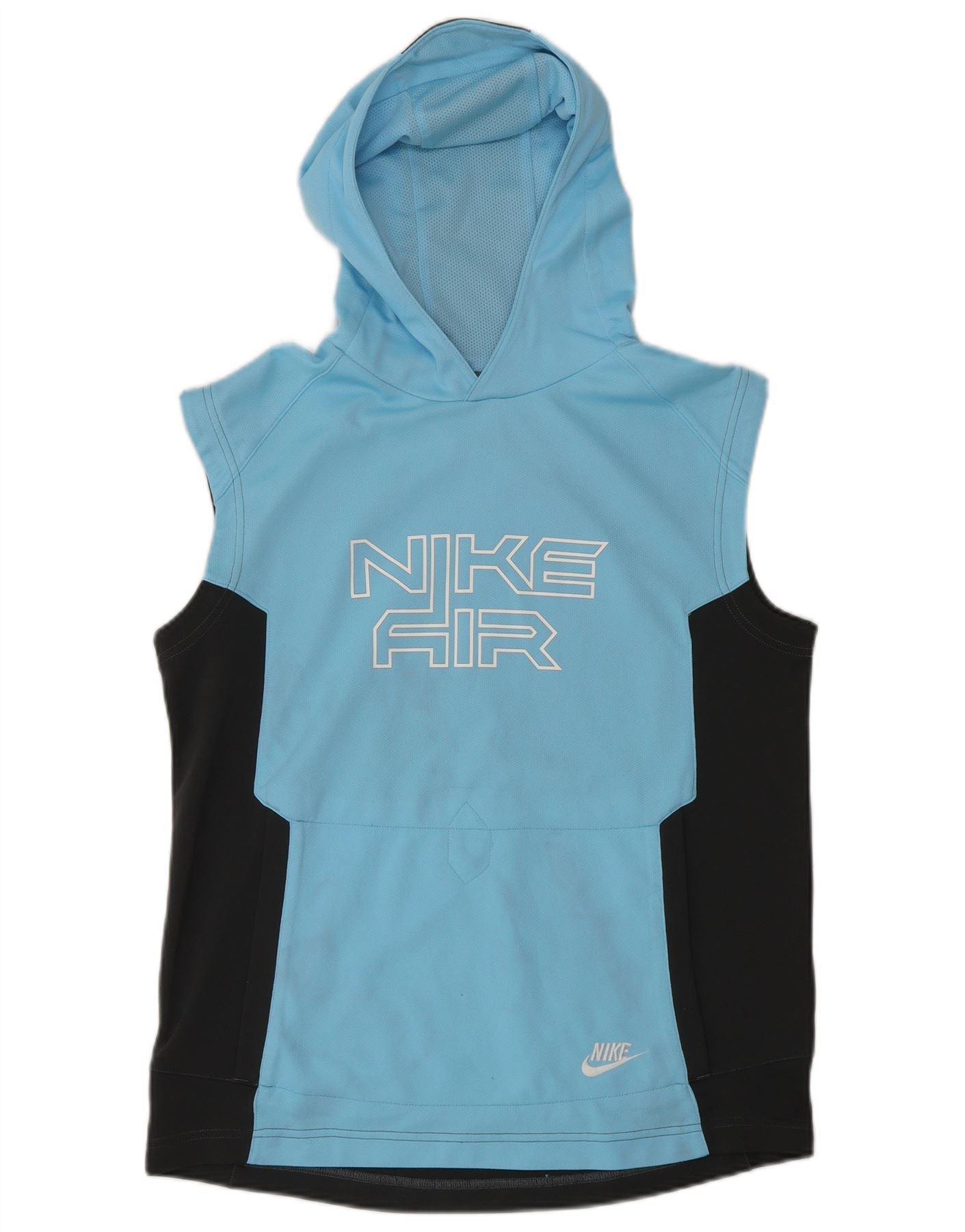 - KI-Beschreibung: Dieser ärmellose Kapuzenpullover für Jungen von Nike ist aus atmungsaktivem 100-prozentigem Polyester-Jersey gefertigt. Es verfügt über ein leuchtendes blaues und schwarzes Farbblockdesign. Der Pullover-Stil verfügt über einen Stehkragen und eine praktische Kapuze. Eine markante Nike Air-Grafik ziert die Vorderseite, darunter ein kleineres Nike-Logo. Seine reguläre Passform sorgt für Komfort beim Sport und Training.