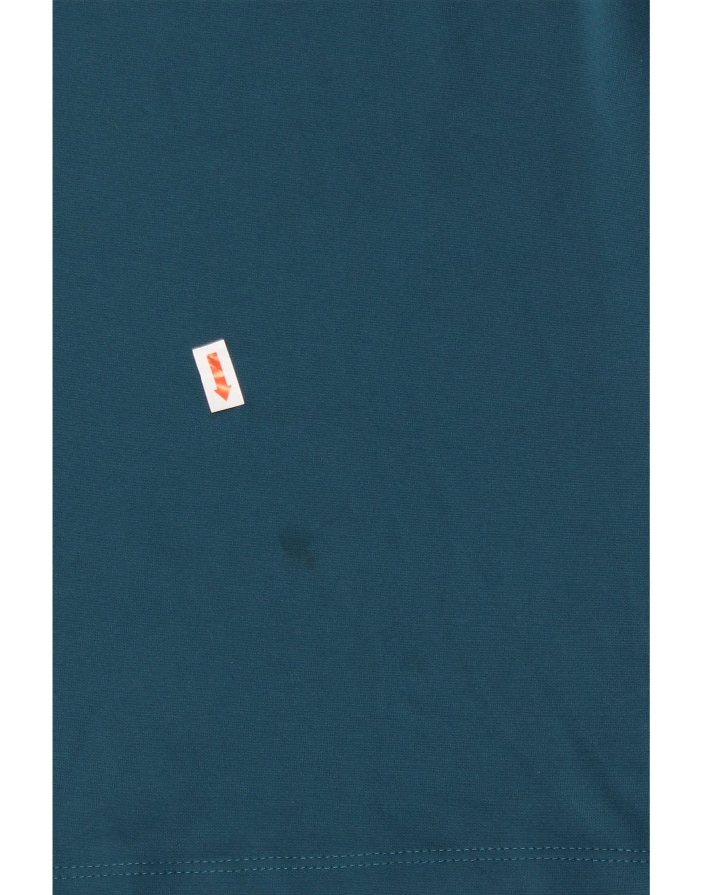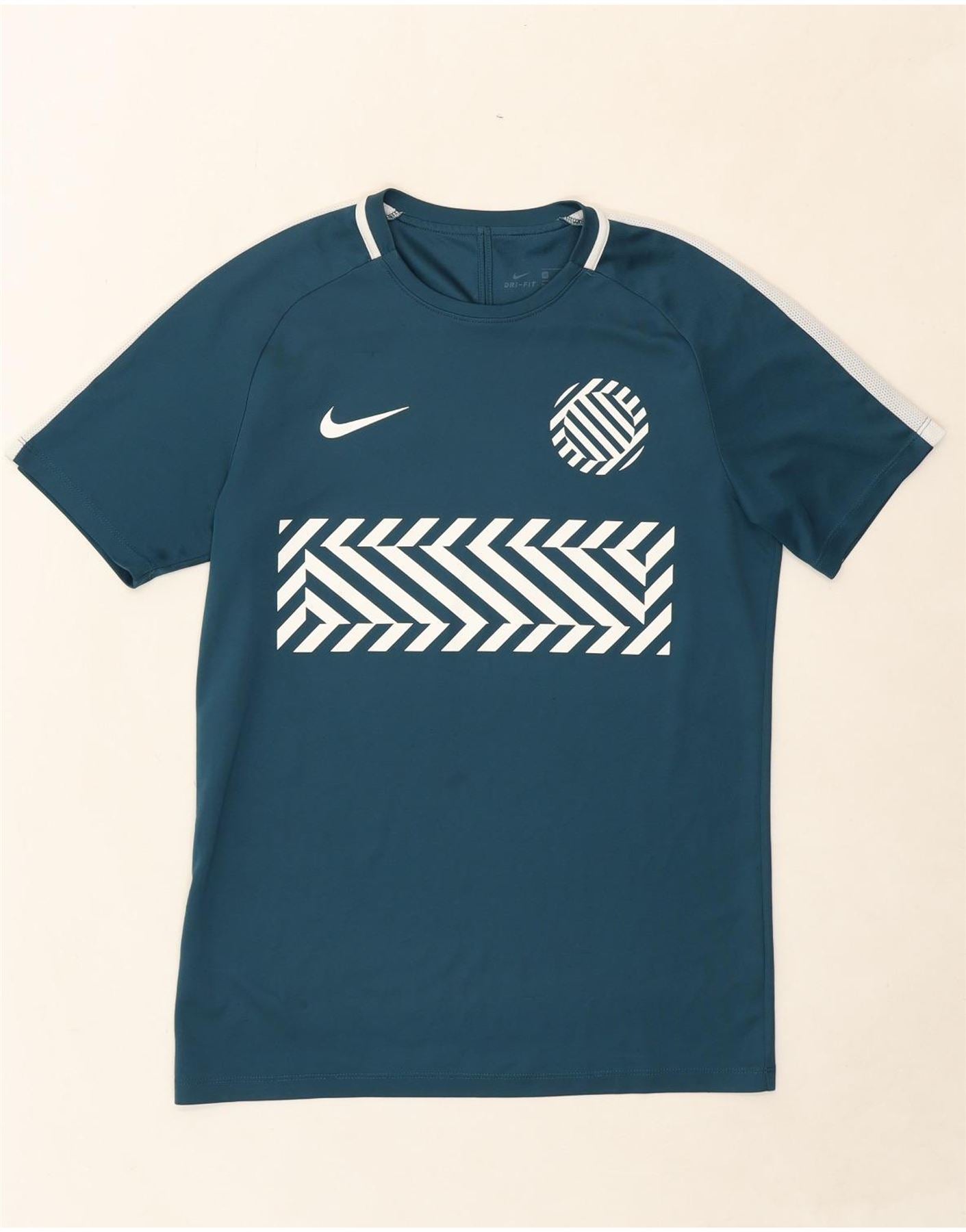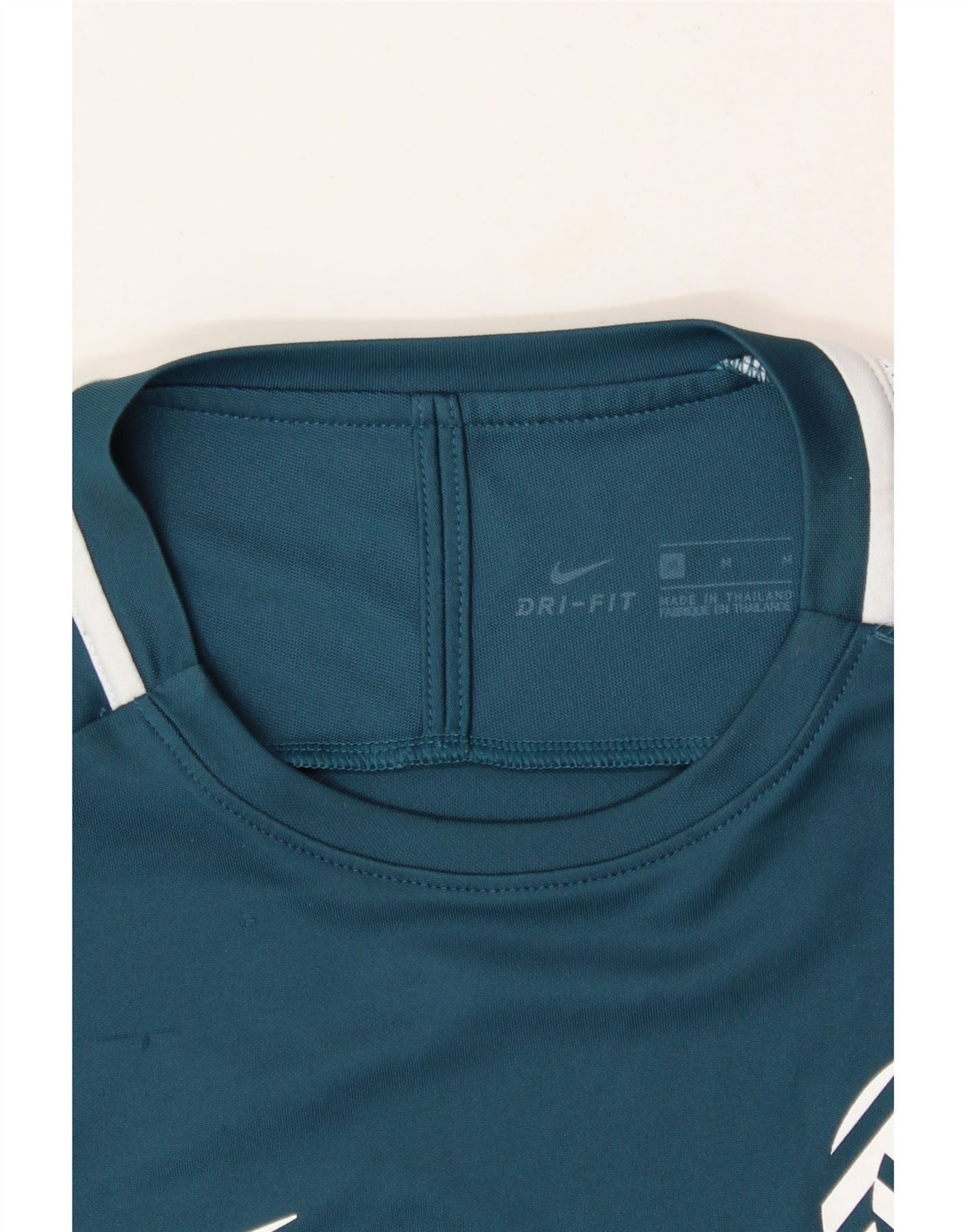 - AI Description: Elevate your sportswear with this pre-owned Nike T-shirt. Crafted from breathable knit polyester, this men's top features a geometric pattern and short sleeves. The round neck and regular fit ensure comfort, while the striking graphic and logo accent add a sporty touch. Despite minor discoloration and stains on the front and back, this blue T-shirt, made in Thailand, remains in good condition. Label size: M. Perfect for sports or casual wear.