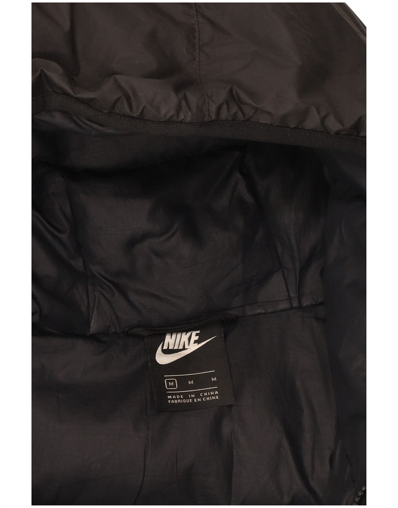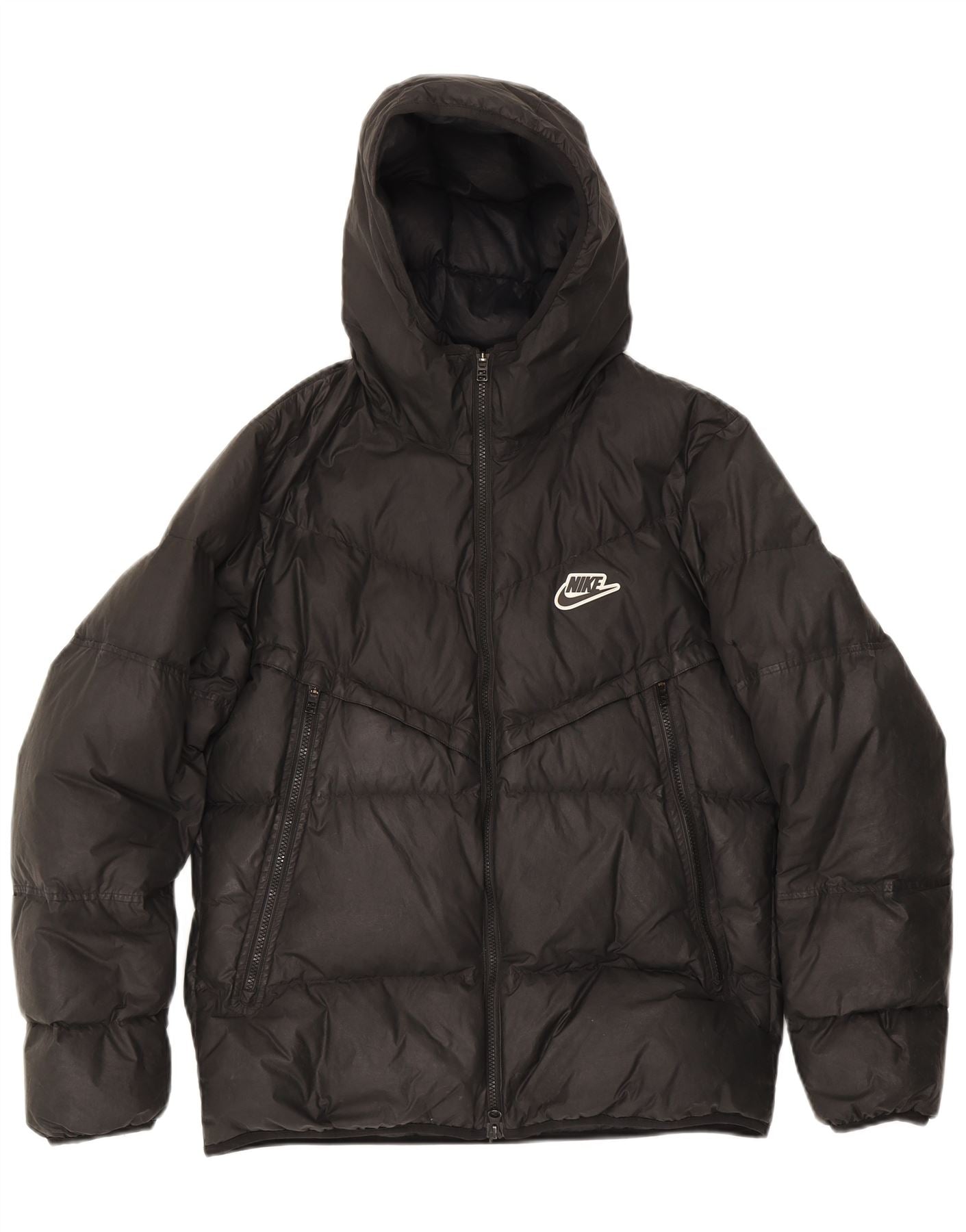 - AI Description: This Nike mens padded jacket features a black padded design with a down fill, offering exceptional warmth. It has a high neck and a full zip closure for secure fastening. The long sleeves and regular fit ensure comfortable wear. A practical hood provides extra protection. Functional pockets add utility. A subtle logo accent completes the athletic style.