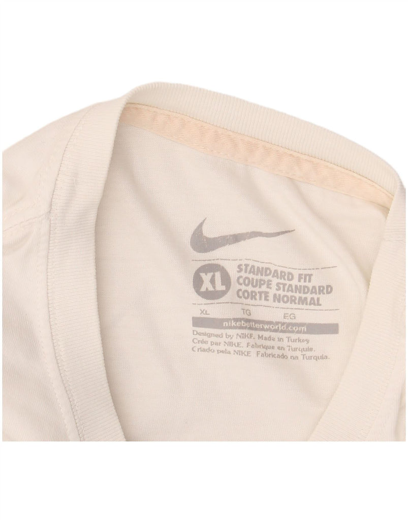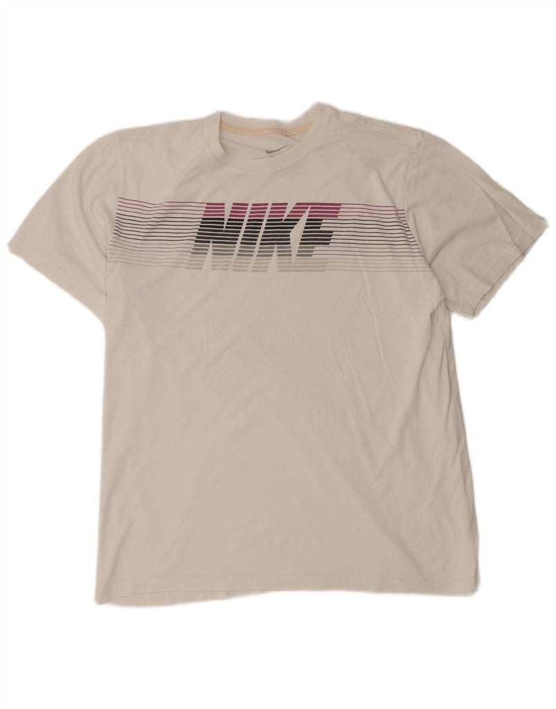 - AI Description: This Nike mens Graphic T-Shirt Top is crafted from soft jersey fabric in an off white hue. It features a classic round neck and short sleeves. The pullover design offers a comfortable standard fit. A subtle striped pattern adds visual interest. This lightweight and breathable top ensures comfort for everyday wear.