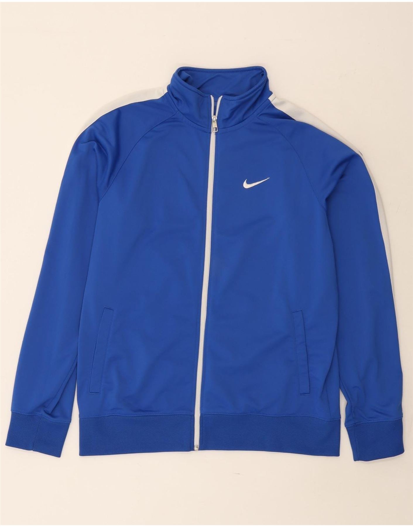 - KI-Beschreibung: Diese Nike Herren-Trainingsjacke ist aus glattem Polyester-Jersey gefertigt. Es verfügt über einen hohen Kragen und einen durchgehenden Reißverschluss. Lange Ärmel enden in Bündchen an den Handgelenken. Das blaue Colourblock-Design wird durch weiße Streifen an den Ärmeln akzentuiert. Ein dezentes Nike-Logo ist vorhanden. Es verfügt über praktische Taschen und bietet eine normale Passform.