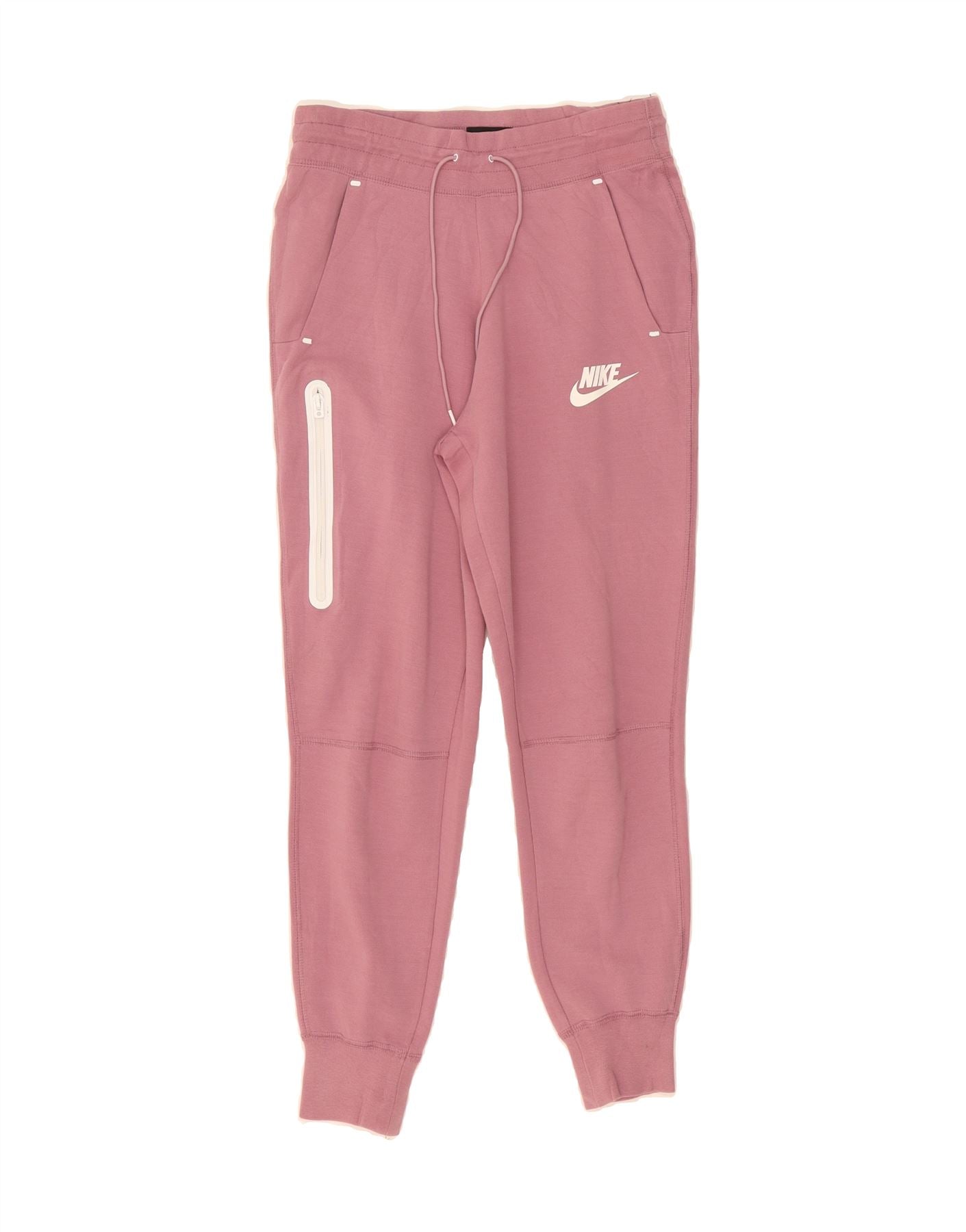 - AI Description: Nike women's pink sports trousers, size XS TP. These pre-owned joggers are in excellent condition, crafted from a fleece knit blend of 62% cotton and 38% polyester. Featuring a comfortable regular fit with an elasticated drawstring waist, they include practical pockets and a logo accent. Note minor defects: loose stitching on the waistband, slight wear on the knees, and label discolouration.