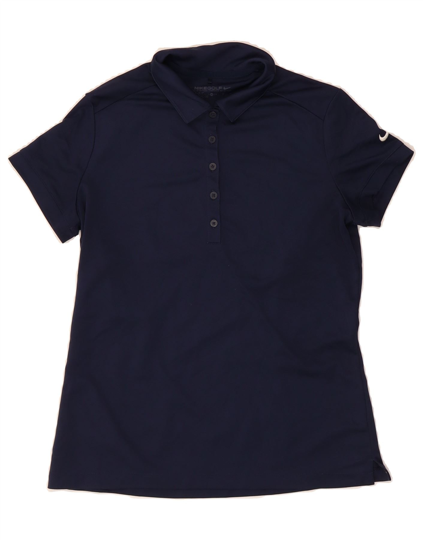 - AI Description: This Nike women's polo shirt in navy blue is crafted from 100% polyester with Dri-FIT technology, ensuring breathable comfort during active wear. Featuring a classic fit and short sleeves, it offers a regular silhouette with a buttoned collar for a polished look. The double-breasted design adds a subtle touch of sophistication, while the iconic Nike logo accentuates its sporty style. Ideal for golf or casual sportswear, this pre-owned shirt is machine washable and tumble dry safe, combining performance with effortless style.