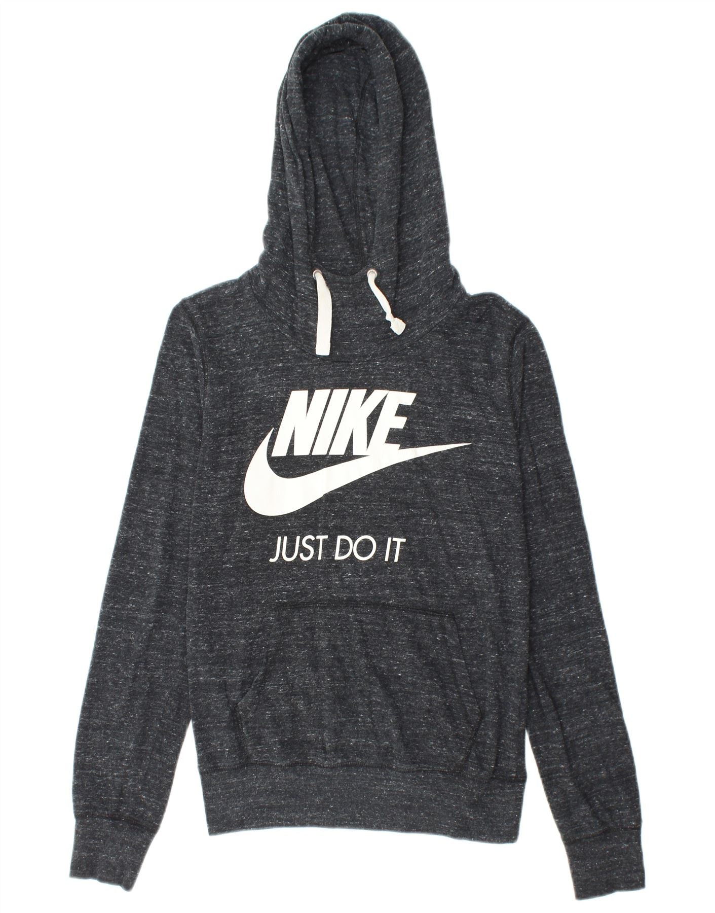 NIKE Womens Graphic Hoodie Jumper UK 10 Small Navy Blue Flecked Cotton
