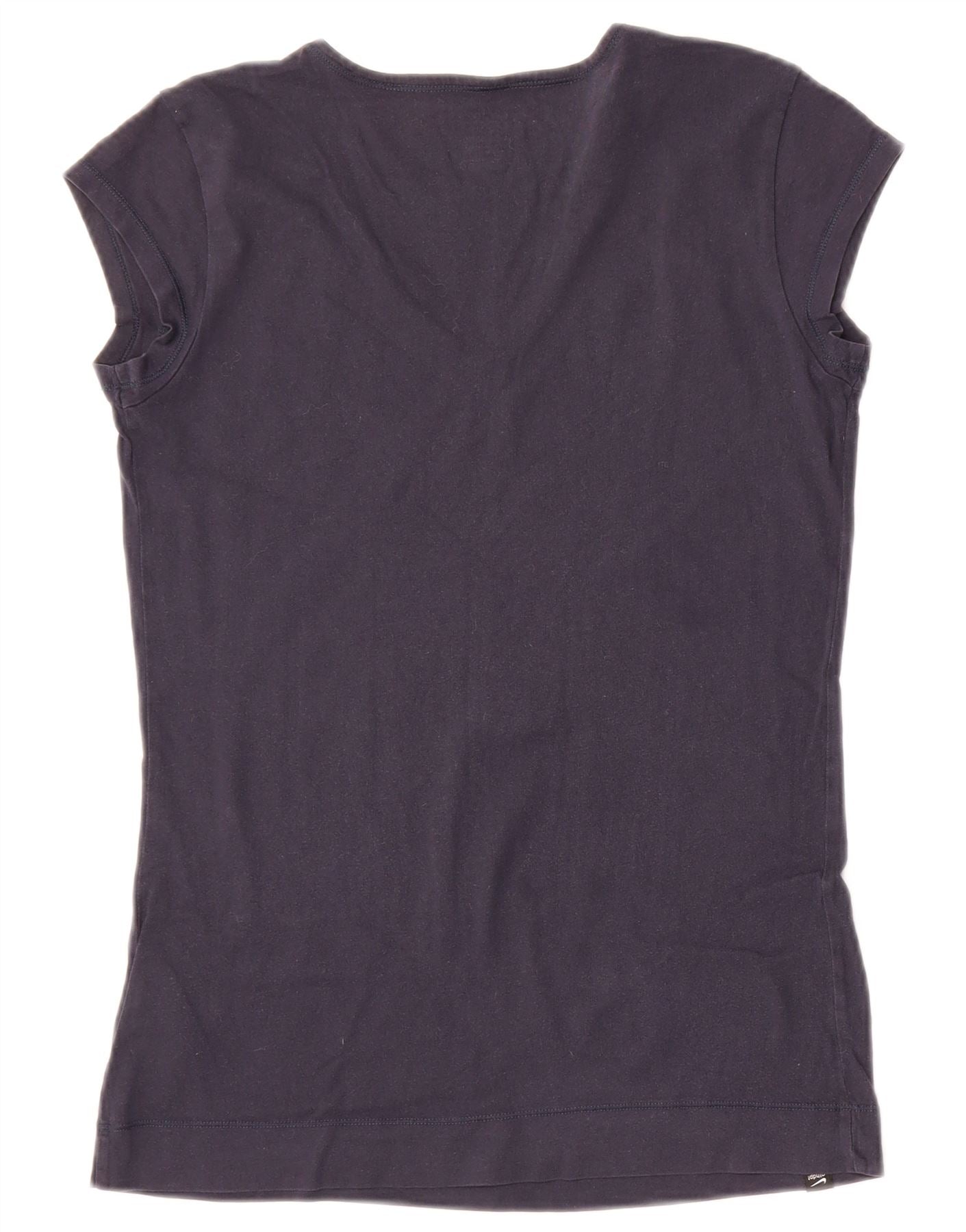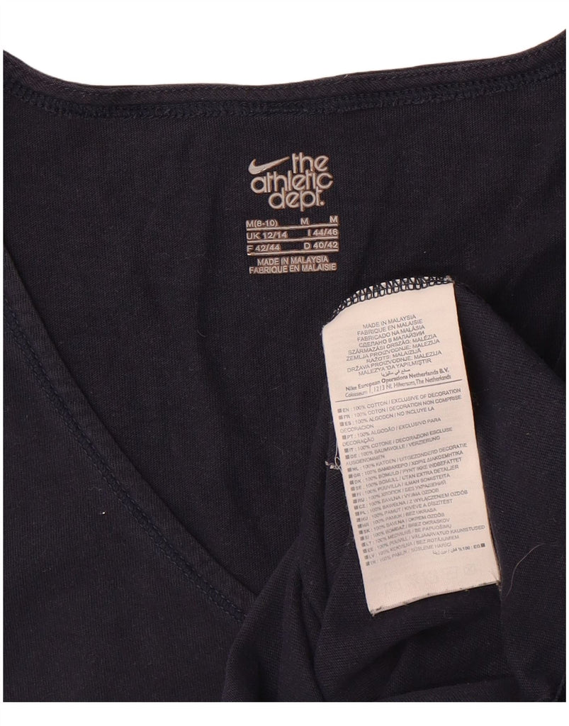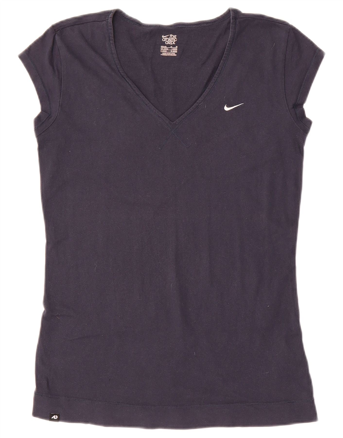 - AI Description: This Nike womens T-shirt top is crafted from soft navy blue cotton jersey. The fabric offers a lightweight and breathable texture, ensuring comfort. It features a flattering V-neckline and classic short sleeves. A regular fit provides an easy pullover style. The iconic Nike logo adds a distinctive branded detail.
