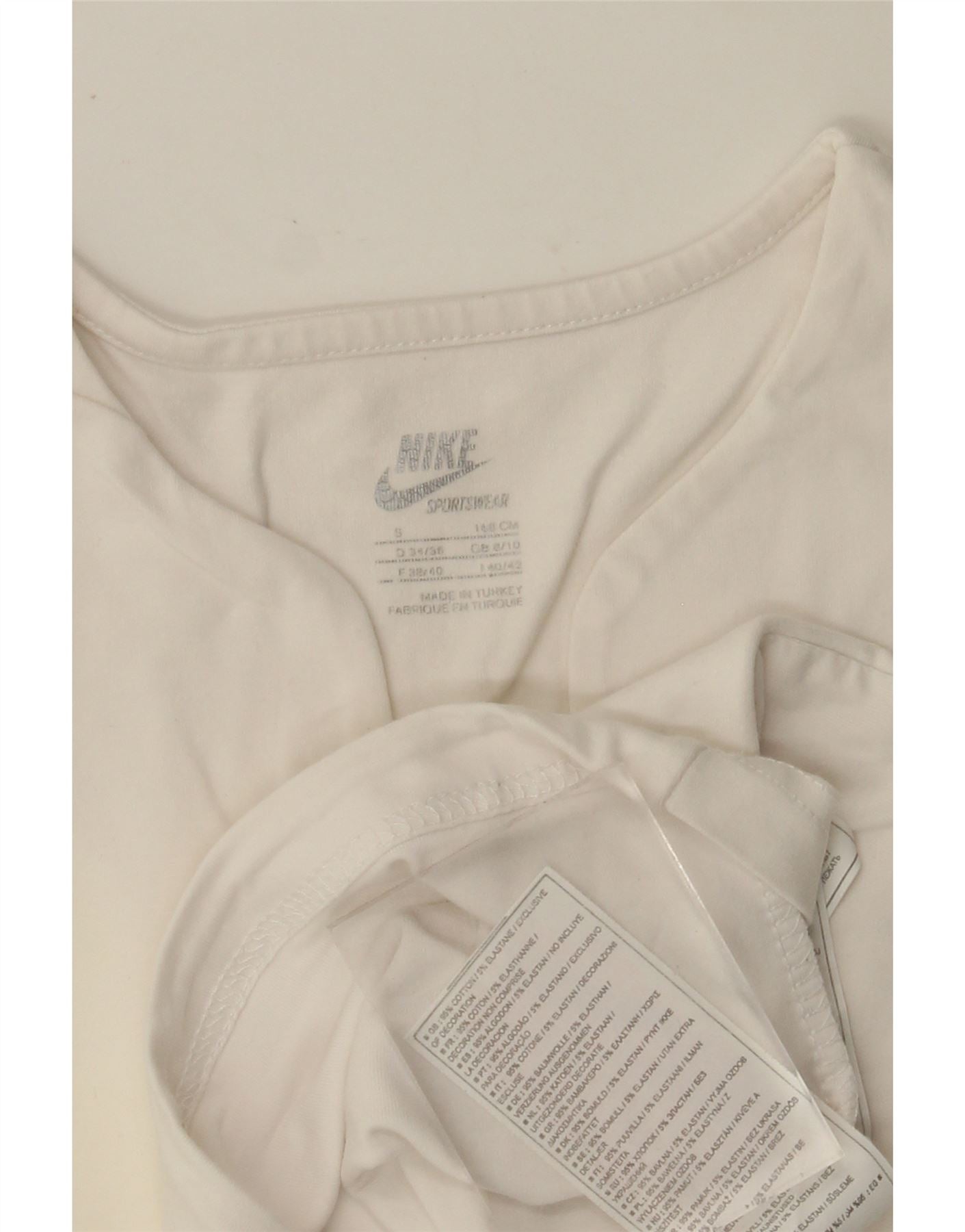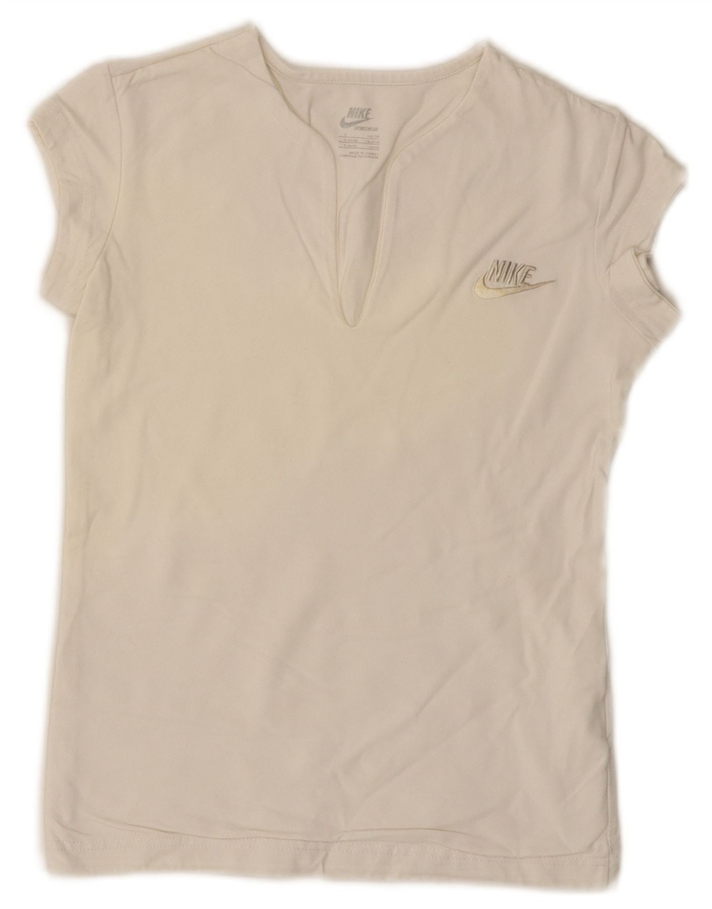 - AI Description: This Nike womens T-shirt top is crafted from a lightweight cotton blend, offering stretch and comfort. It features a classic V-neckline and short sleeves. The regular fit ensures ease of movement. A subtle logo accent adds a signature touch. This pullover style is perfect for sports or casual wear.