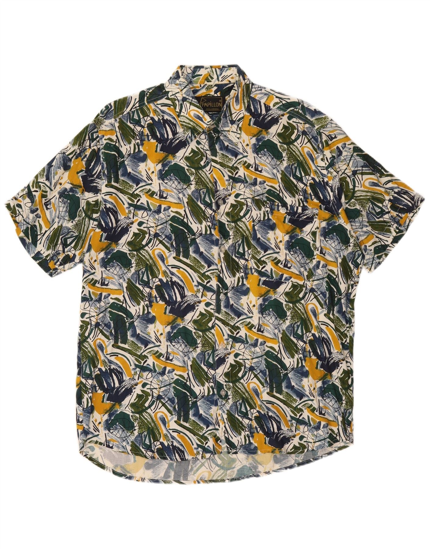 - KI-Beschreibung: Dieses Herrenhemd von Papillon besteht zu 100 Prozent aus Viskose und bietet ein leichtes und atmungsaktives Tragegefühl. Es verfügt über ein lebendiges, mehrfarbiges abstraktes Muster mit Grün-, Gelb- und Blautönen. Der Kragenausschnitt und der Knopfverschluss vorne sorgen für eine klassische Struktur. Kurze Ärmel und eine entspannte Passform sorgen für bequemen, lässigen Tragekomfort. Dieses Hemd vereint künstlerisches Flair mit mühelosem Stil.