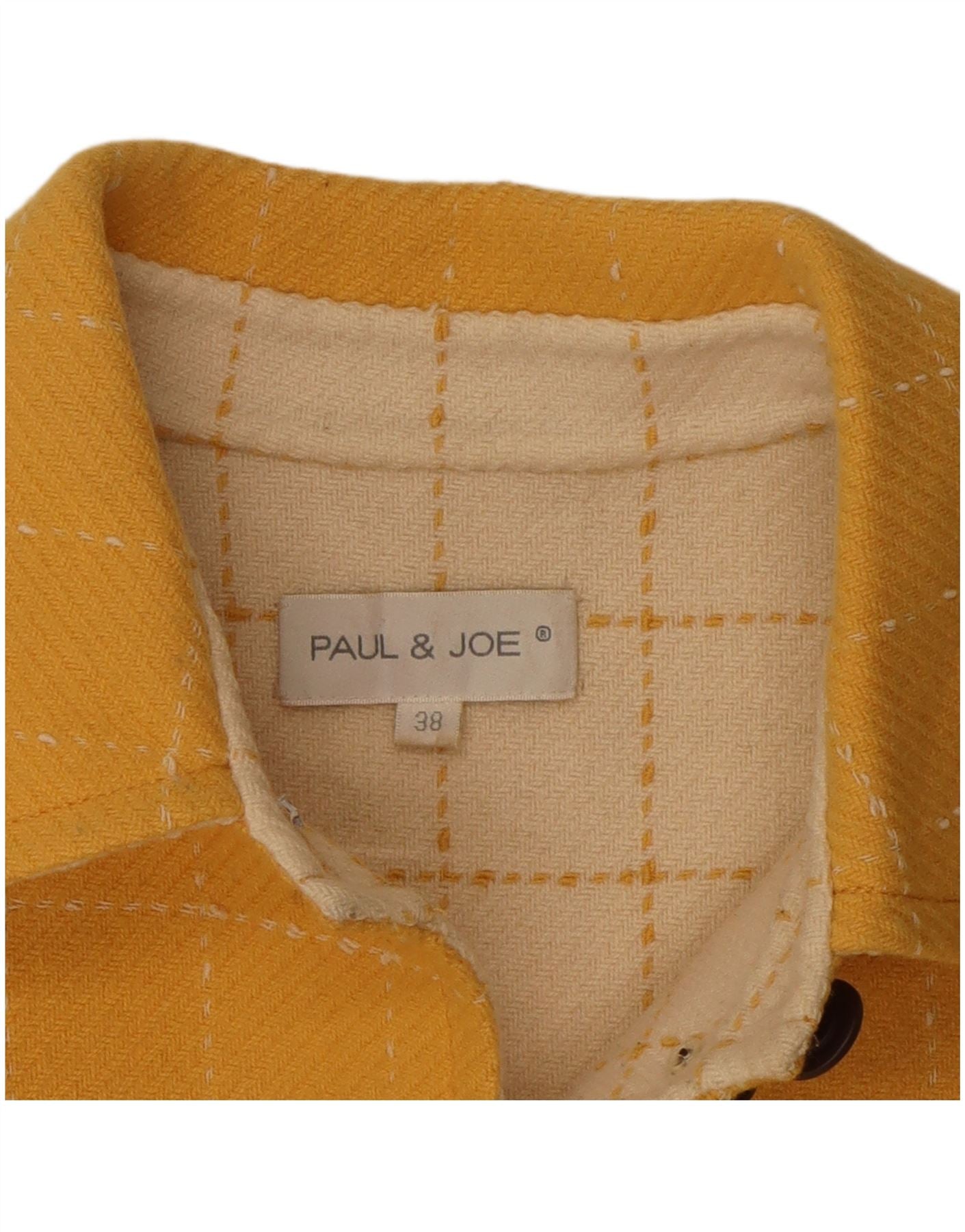 - AI Description: This Paul & Joe womens trench coat features a vibrant yellow check pattern. Crafted from a quality woven fabric, it offers a structured yet comfortable feel. The classic collared neckline and long sleeves provide a timeless silhouette. A button-up front and belted waist define the shape, while practical pockets add functionality. Its regular fit ensures comfortable wear, blending classic style with a modern aesthetic.