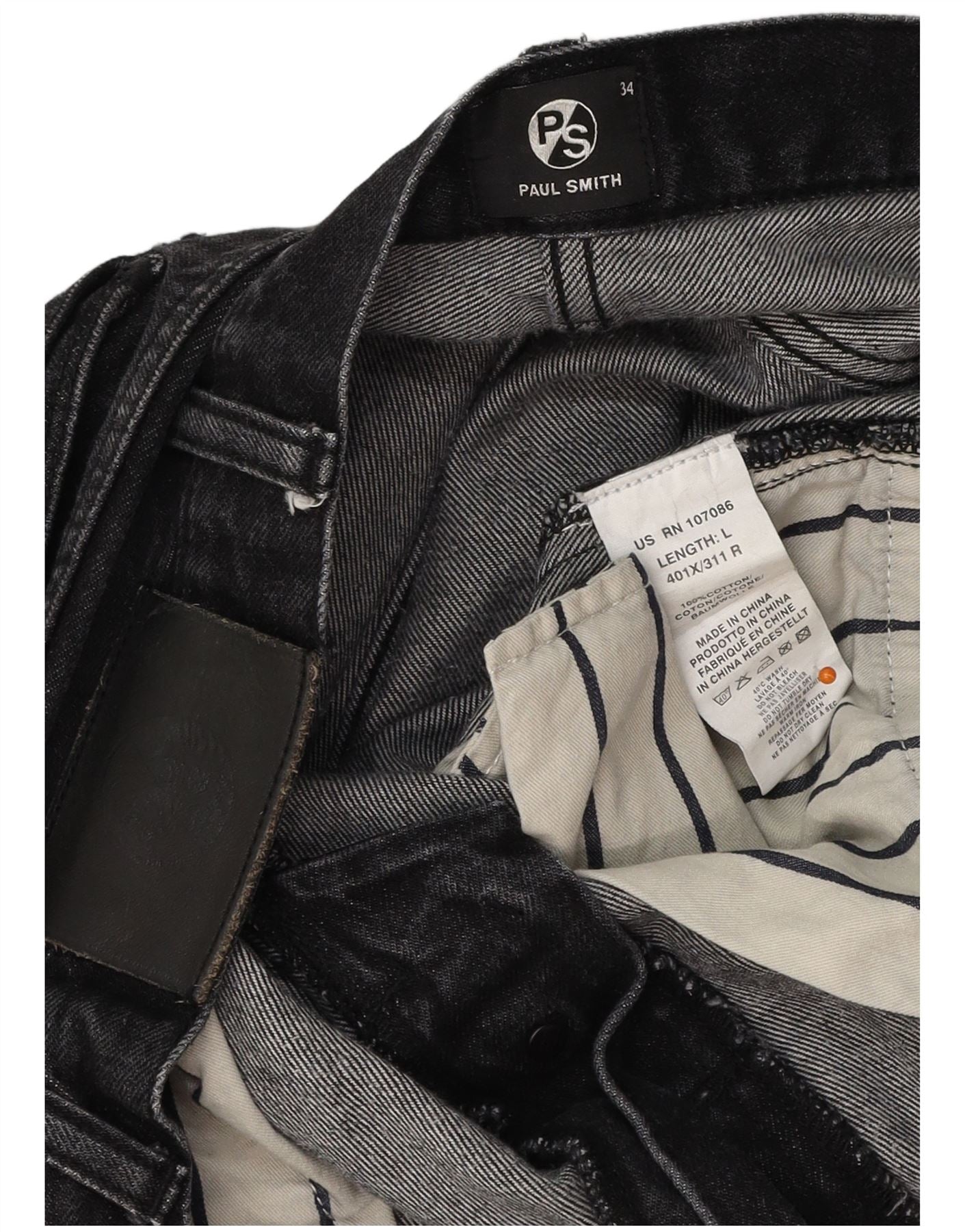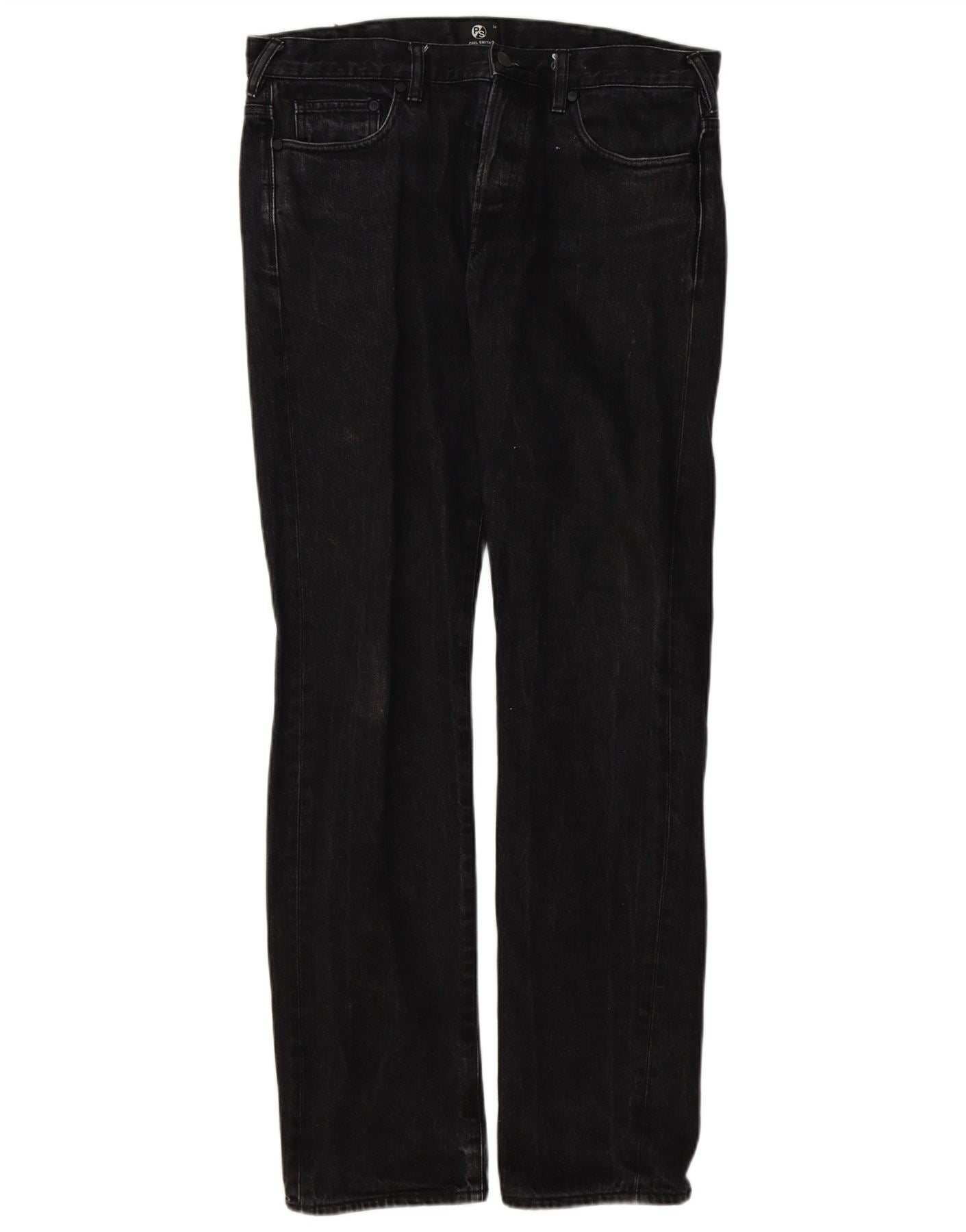 - AI Description: This Paul Smith mens straight jeans are crafted from 100 percent black cotton denim. They feature a classic straight fit and a secure button closure. The design includes practical pockets for convenience. A subtle logo accent adds a touch of brand recognition. These jeans offer a timeless, regular fit, perfect for everyday wear.