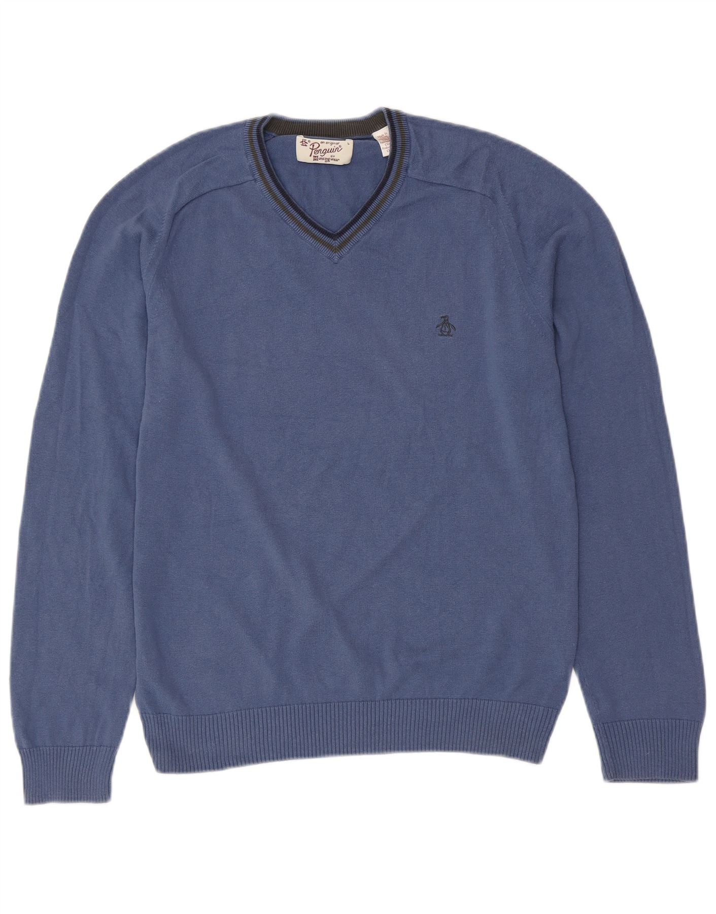 PENGUIN Herren-Pullover mit V-Ausschnitt, groß, aus blauer Baumwolle