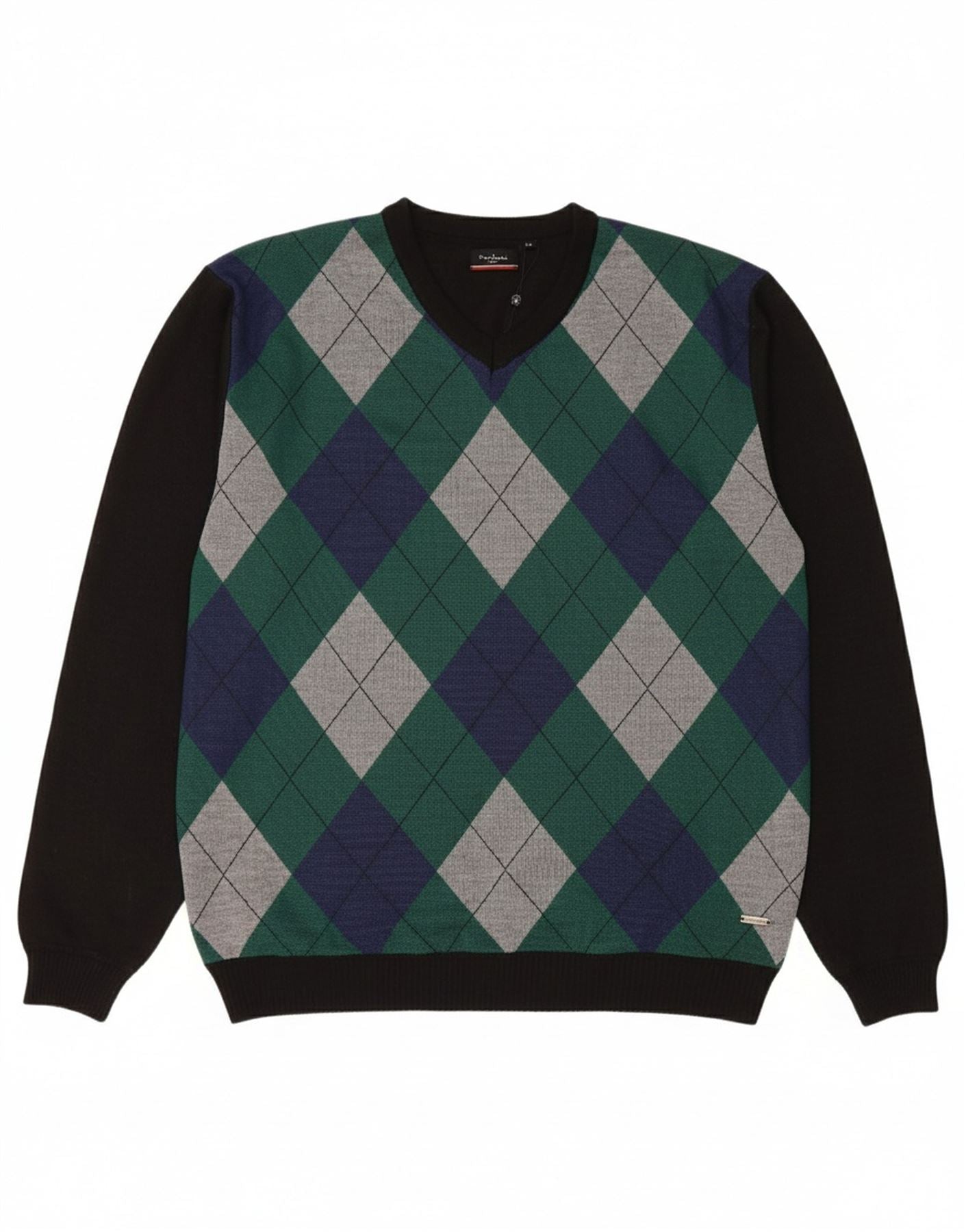 - AI Description: This Pierre Cardin men's V-Neck Jumper Sweater is crafted from soft knit fabric. The classic V-neckline offers a refined look, perfect for layering. Long sleeves and a regular fit ensure comfortable wear. A sophisticated argyle pattern in black and subtle accent colours adds a touch of classic style.