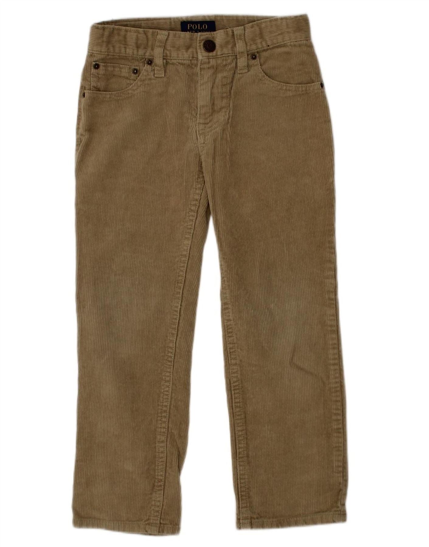 - AI Description: This Polo Ralph Lauren boys corduroy trousers are crafted from soft, textured khaki corduroy. They feature a classic button closure and a straight leg fit for comfortable wear. The design includes practical pockets and an adjustable waist for an ideal fit. This regular fit style offers timeless comfort and a smart, casual aesthetic.