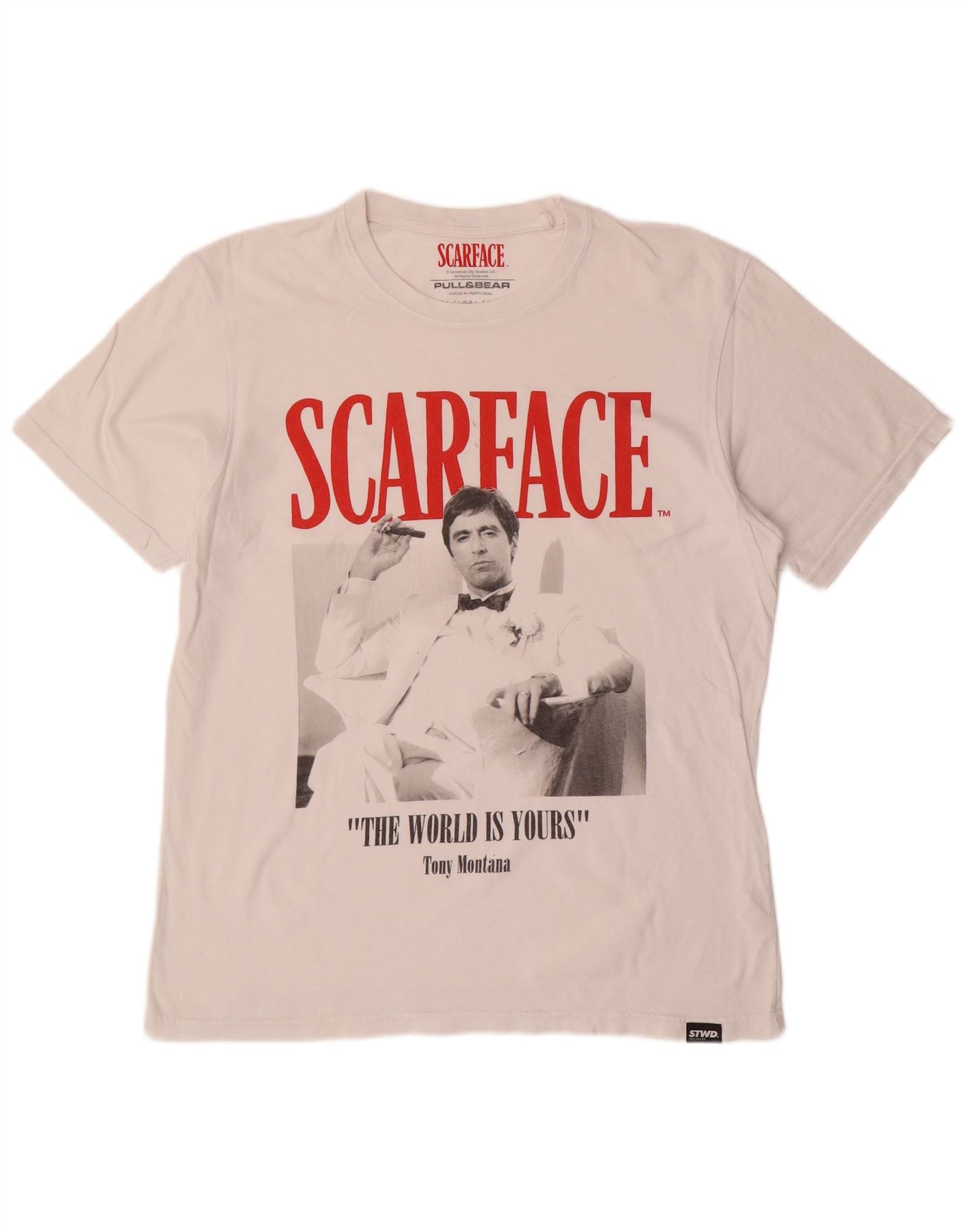 PULL & BEAR Herren-T-Shirt mit Scarface-Grafik, Größe L, aus weißer Baumwolle