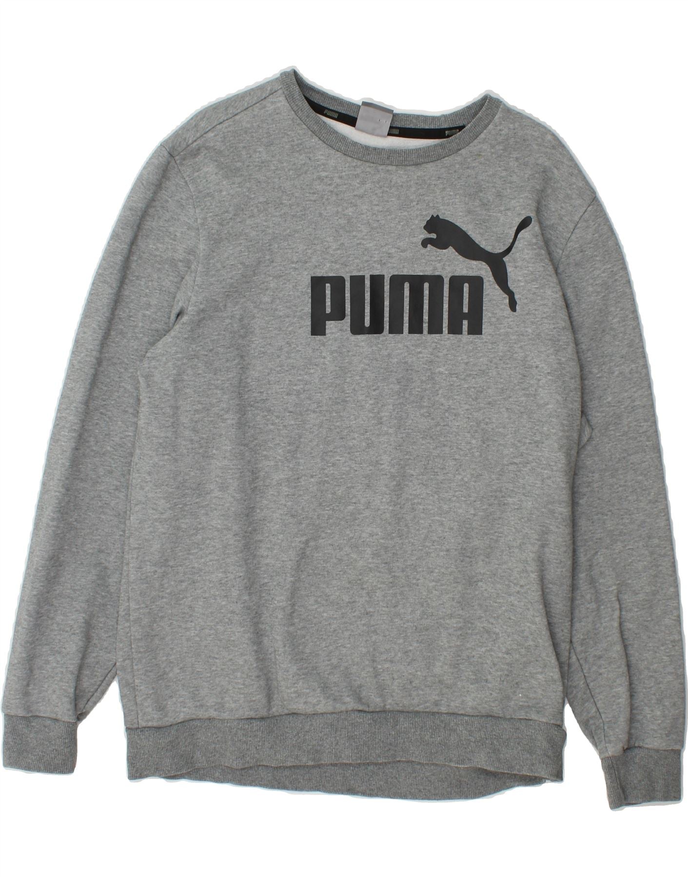 - AI Description: This men's Puma sweatshirt jumper in grey offers classic sports style. Crafted from a comfortable cotton-polyester blend (46% cotton, 54% polyester), it features a traditional round crew neck and long sleeves with cuffed wrists. The pullover design boasts an elasticated hem and an embroidered Puma logo accent on the chest. It provides a regular fit, making it a versatile addition to any casual wardrobe.