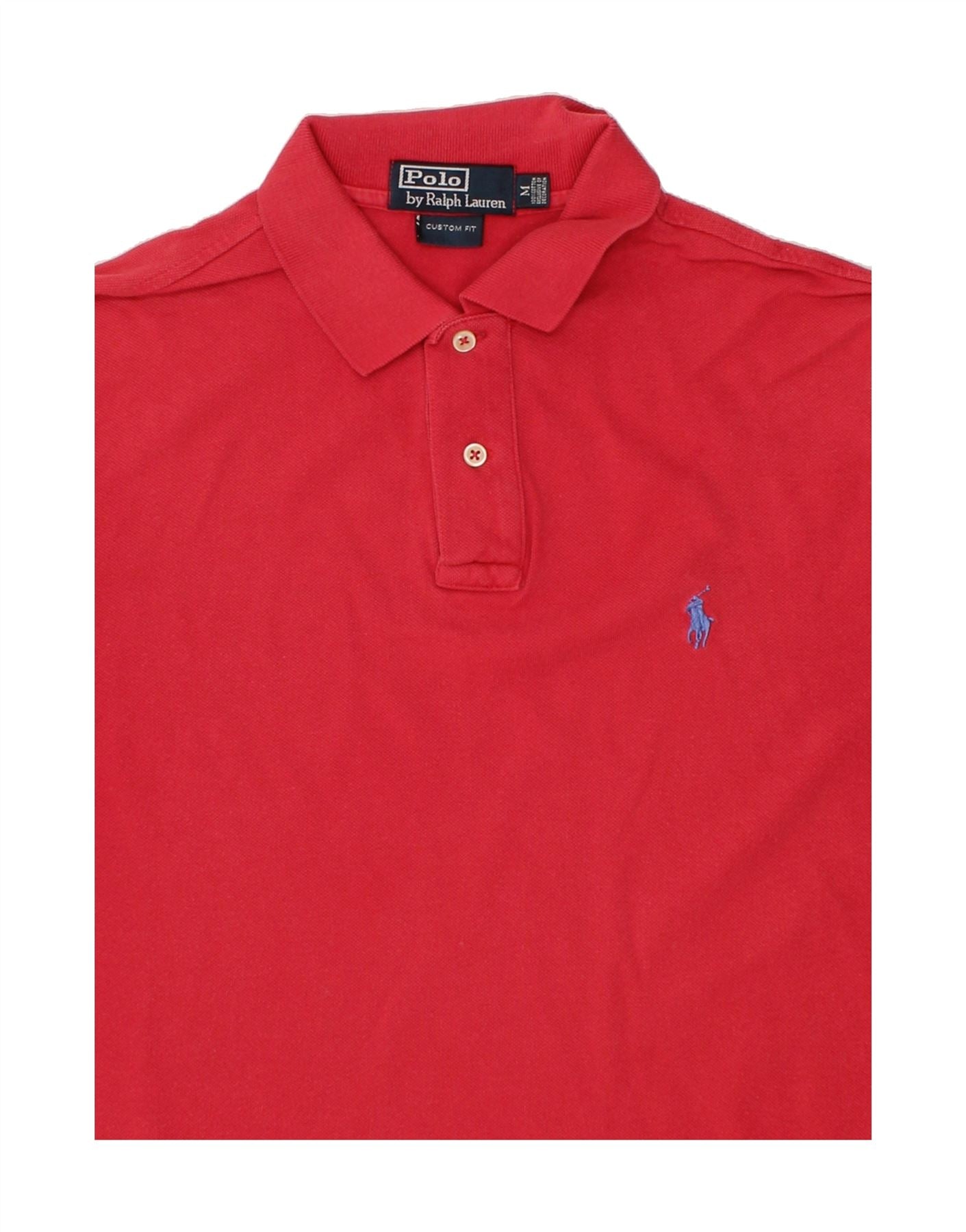 - AI Description: Elevate your wardrobe with this pre-owned Ralph Lauren polo shirt. Crafted from breathable knit cotton, this red short-sleeve polo boasts a regular fit, perfect for a preppy aesthetic. Features include a collared neckline, button closure, and subtle logo accent. The garment shows minor visible wear, adding character. Size M. Ideal for casual occasions. Washing instructions not available.