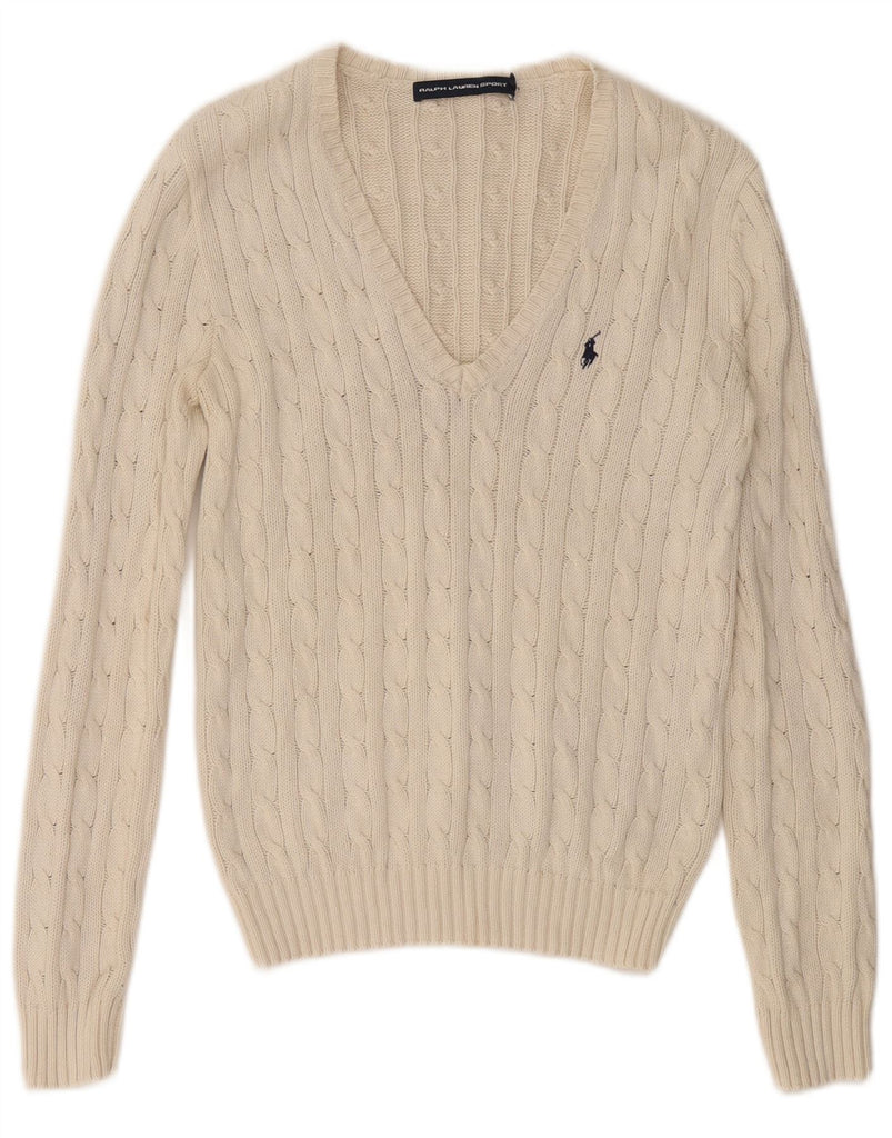 RALPH LAUREN Womens V-Neck Jumper Sweater UK 14 Large White Cotton