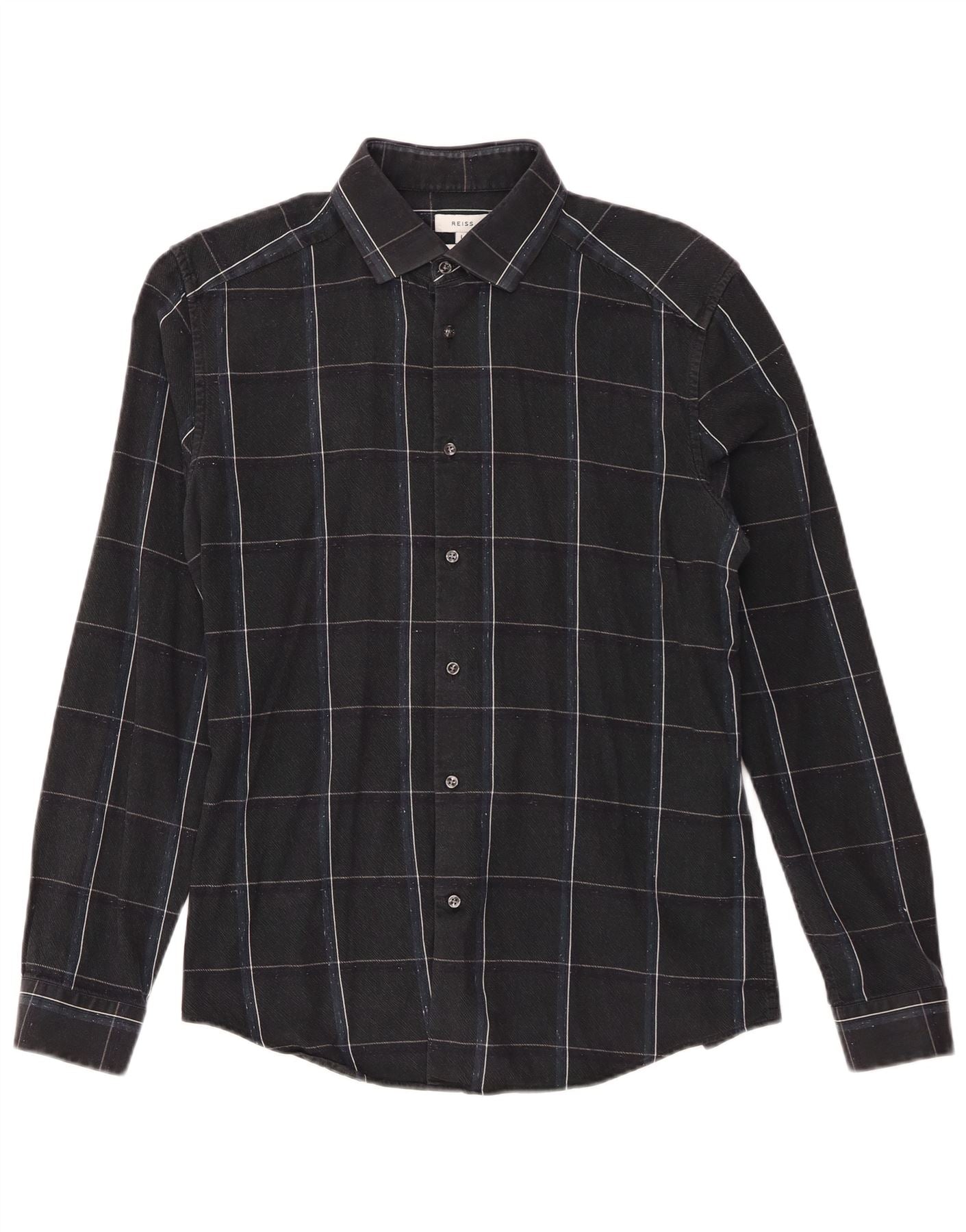 - KI-Beschreibung: Dieses Herrenhemd von Reiss ist aus einer schwarzen, gewebten Baumwollmischung mit dezentem Stretch gefertigt. Es verfügt über einen Kragenausschnitt und lange Ärmel mit Bündchen. Das Design zeigt durchgehend ein modernes Karomuster. Die Knopfleiste vorne und die schmale Passform sorgen für eine elegante, moderne Silhouette, perfekt für einen raffinierten Look.