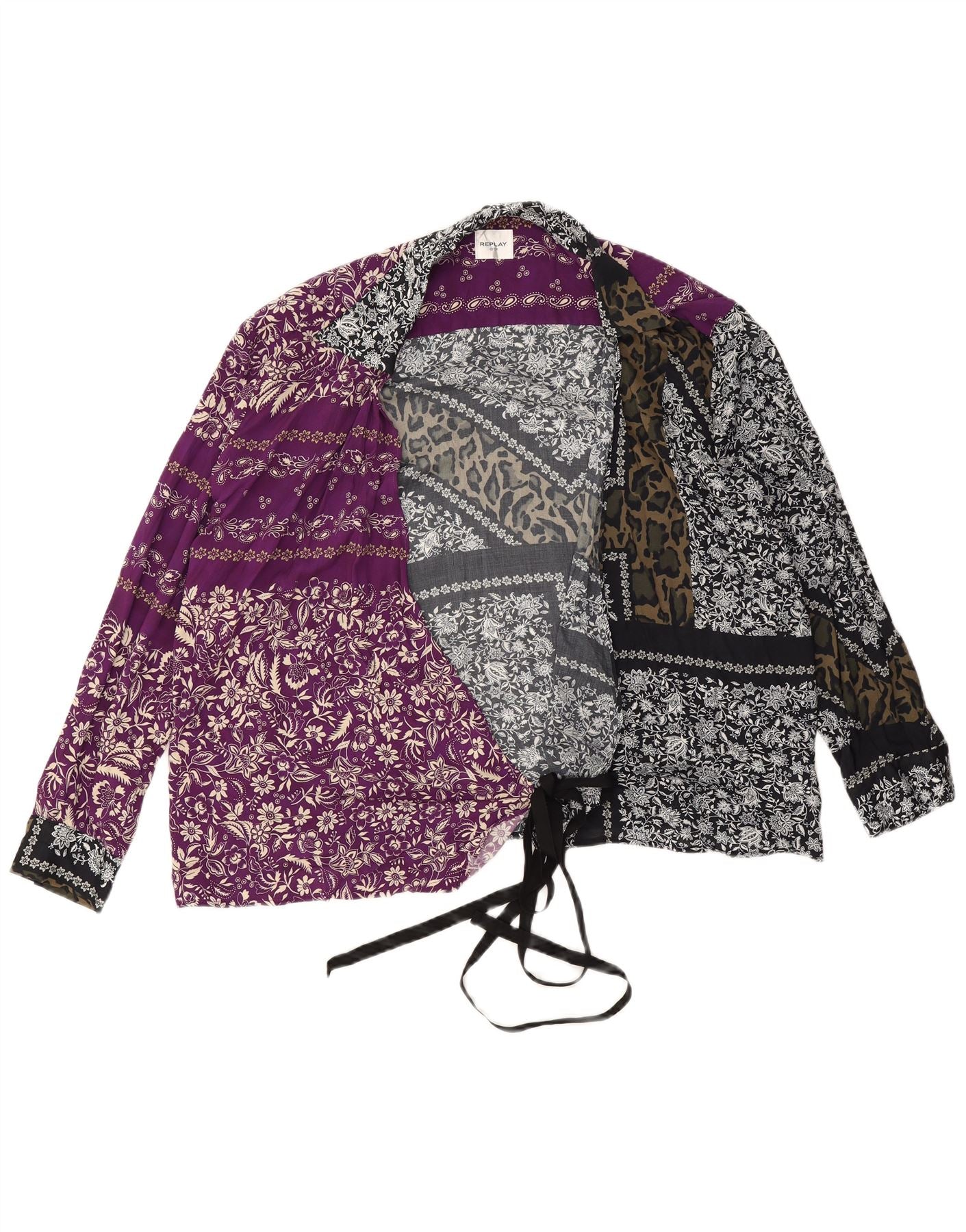- KI-Beschreibung: Diese Replay-Hemdbluse für Damen ist aus einem leichten, gewebten Stoff gefertigt und bietet einen weichen, fließenden Fall. Es verfügt über ein auffälliges Patchwork-Muster in mehrfarbigen Farbtönen, darunter Lila, Schwarz und Grau. Der Kragenausschnitt und die langen Ärmel sorgen für eine klassische Silhouette. Seine entspannte, lockere Passform wird durch ein stilvolles Wickeldesign mit einem Bindeverschluss vorne verstärkt. Dieses vom Bohème-Stil inspirierte Stück bietet mühelosen Stil und Komfort.