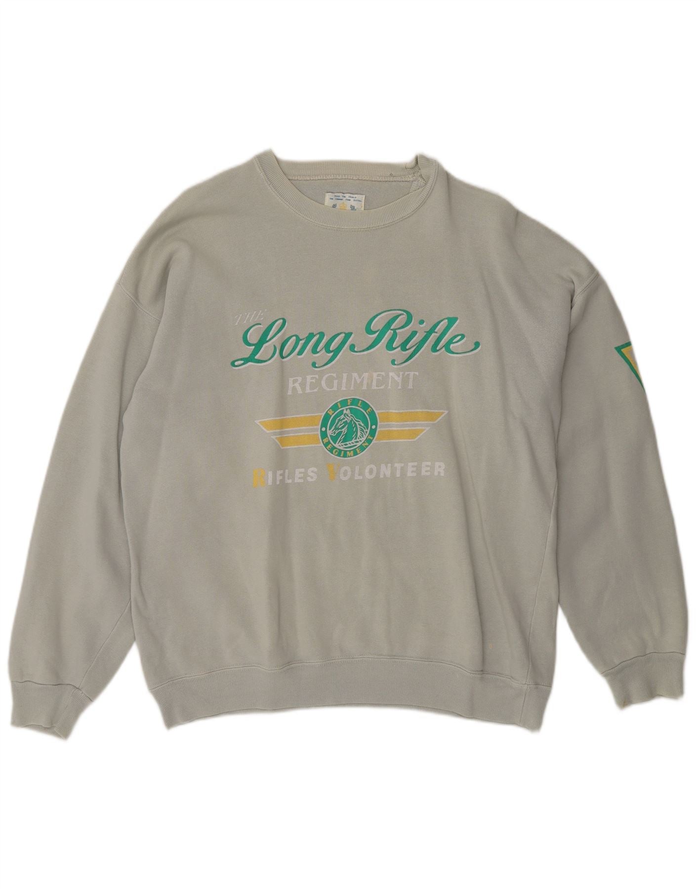 - KI-Beschreibung: Dieser Herren-Sweatshirt-Pullover von Rifle ist aus einem weichen, grauen Baumwollmischfleece gefertigt und bietet Wärme und Komfort. Es verfügt über einen klassischen Rundhalsausschnitt und lange Ärmel. Die reguläre Passform sorgt für eine bequeme Silhouette. Ein markantes Logo für das Long Rifle Regiment ziert die Vorderseite. Auf dem Ärmel befindet sich ein zusätzliches Logo-Detail. Dieses Pullover-Design ist ideal für Freizeitkleidung.