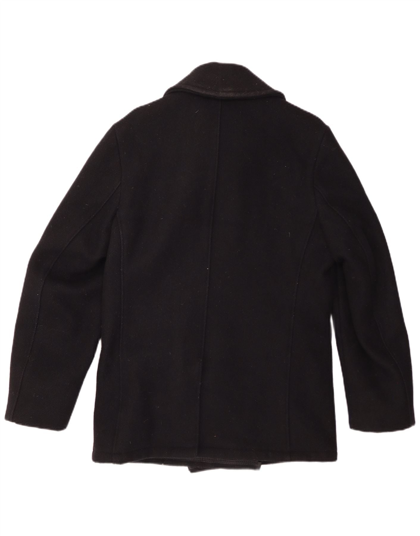 - AI Description: This Schott women's pea coat is crafted from rich, black woven wool. It features a classic collared neckline and a double-breasted front. Tonal button closures add a sophisticated touch. Long sleeves provide ample coverage. The regular fit offers comfort and timeless appeal. Practical pockets complete the design.