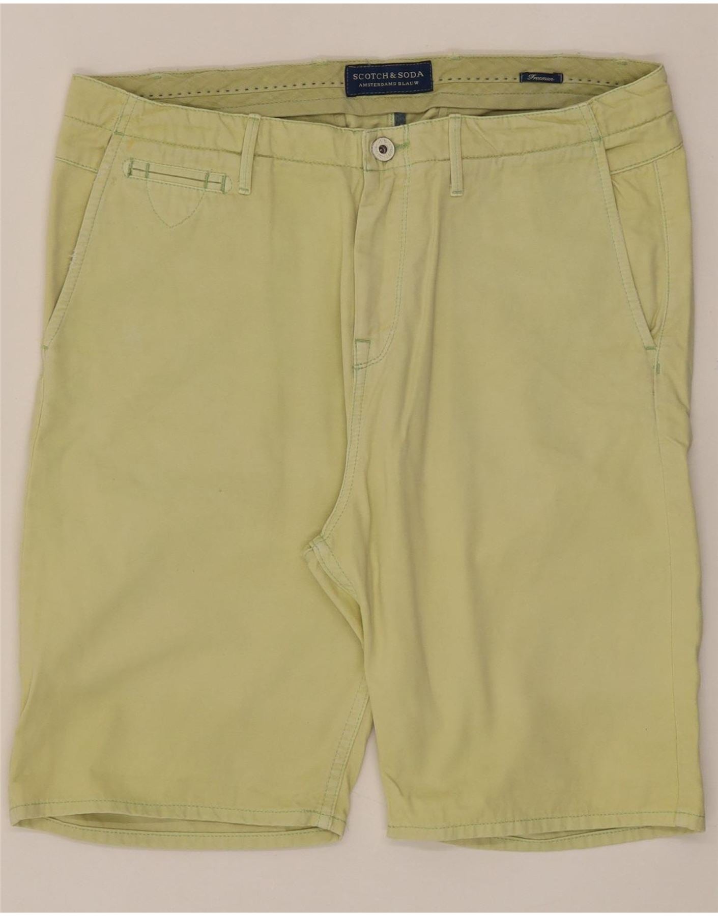 - AI Description: Men's Scotch & Soda classic shorts in yellow denim. These pre-owned shorts, size W33, feature a button closure, regular fit, and practical pockets. Accented with a button and subtle logo detailing. Despite minor stains on the front and slight visible wear throughout, they remain in excellent condition. Crafted in Tunisia, ideal for casual wear. Recommended price: £45.00.