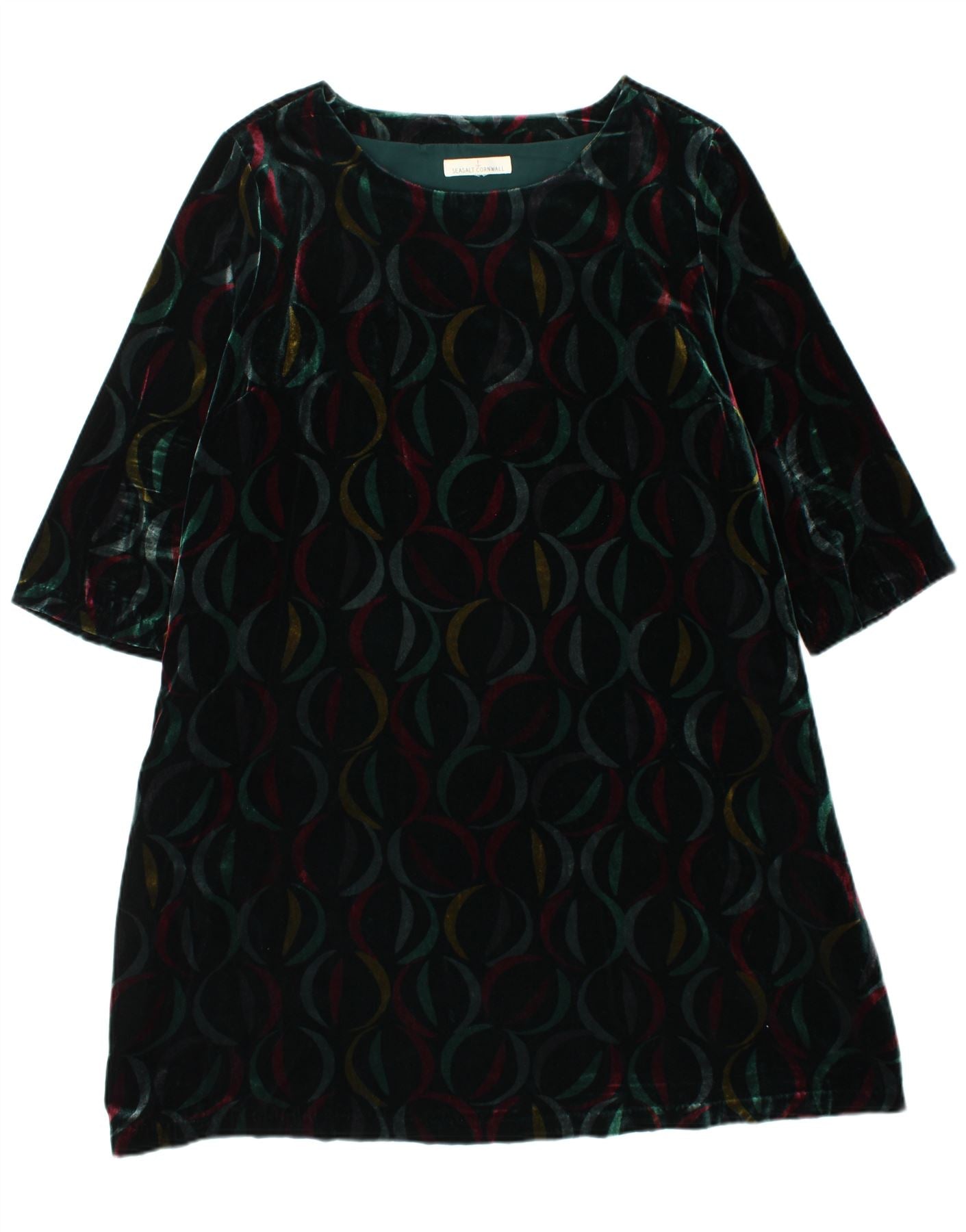- AI Description: This Seasalt Cornwall womens shift dress is crafted from luxurious black velvet, offering a soft, rich texture. It features an abstract geometric pattern, adding modern visual interest. The round neck and 3/4 sleeves provide a classic, comfortable silhouette. Designed as a pullover, its relaxed fit ensures effortless wear and graceful drape.