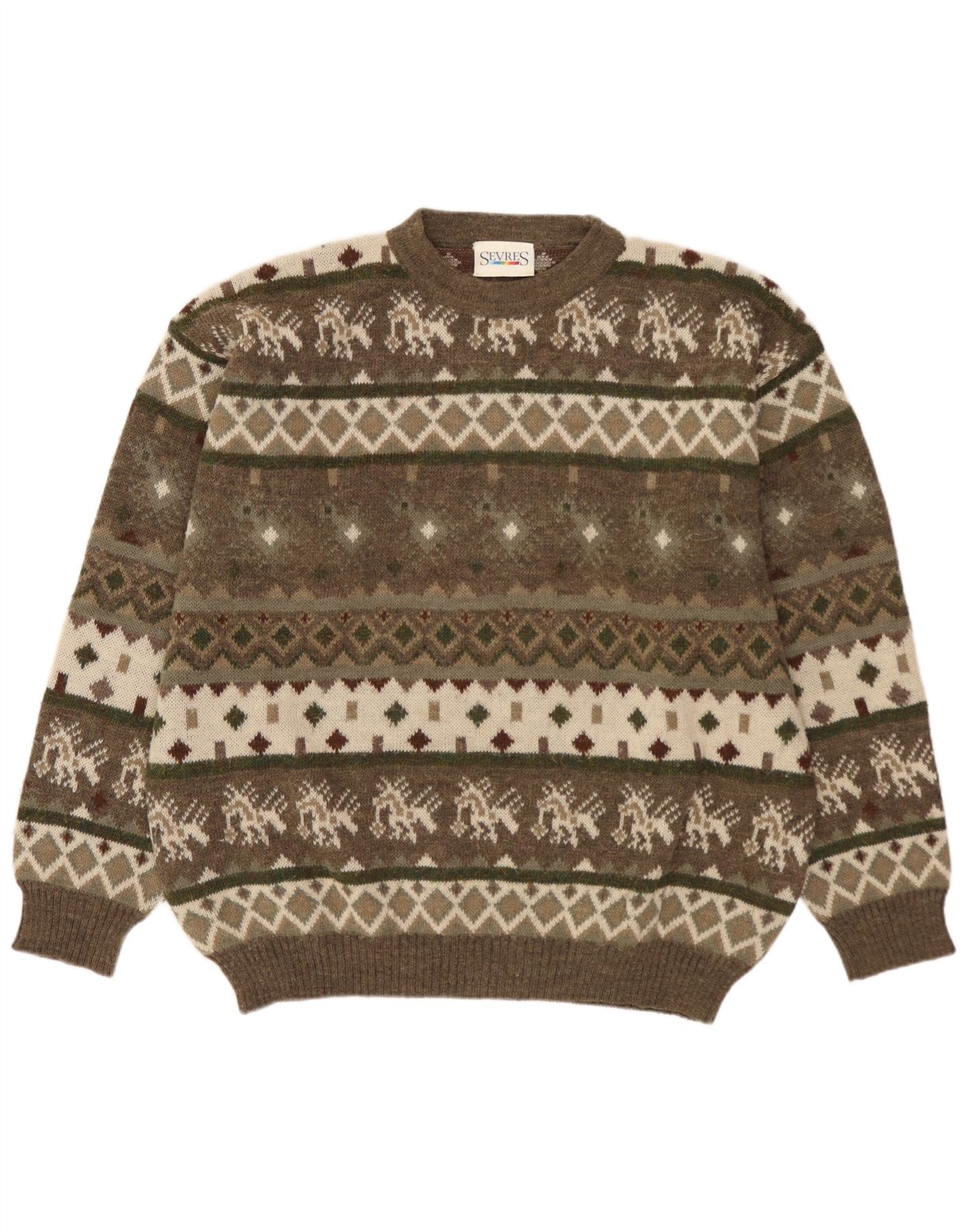 SEVRES Herren-Pullover mit Rundhalsausschnitt, IT 52, große Khaki-Fair-Isle-Wolle