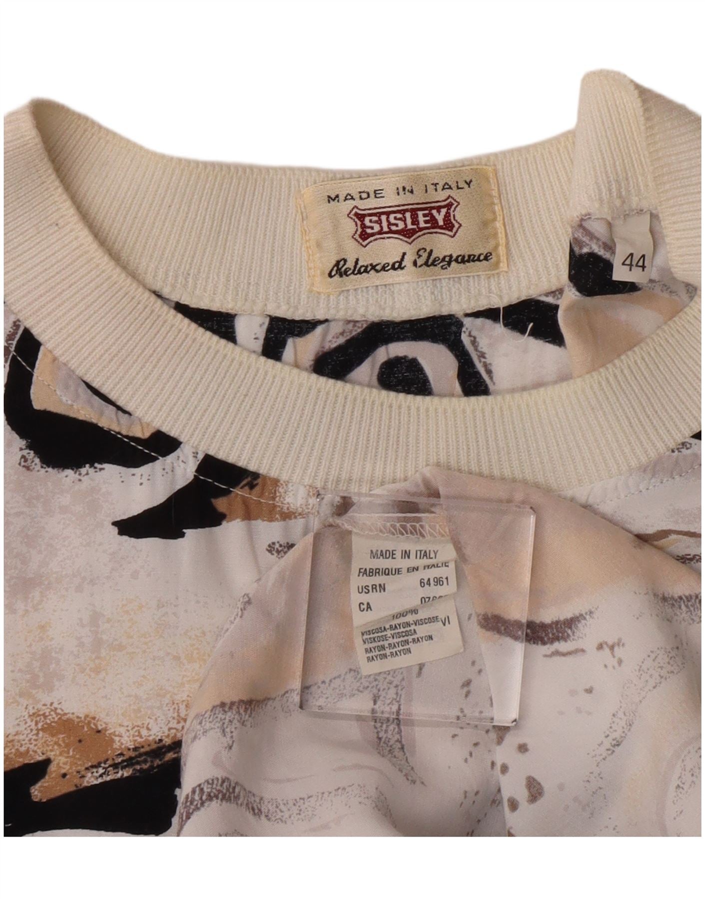 - KI-Beschreibung: Dieses grafische T-Shirt-Oberteil für Damen von Sisley ist aus 100 % weicher Viskose gefertigt und bietet einen glatten, fließenden Fall. Es verfügt über ein auffälliges mehrfarbiges abstraktes geometrisches Muster in Schwarz-, Beige- und gebrochenen Weißtönen. Der Rundhalsausschnitt und die kurzen Ärmel sorgen für eine klassische Silhouette. Entworfen für eine entspannte Passform, sorgt es für angenehmen Tragekomfort. Dieses Pullover-Oberteil vereint künstlerisches Flair mit mühelosem Stil und ist perfekt für eine moderne Garderobe.