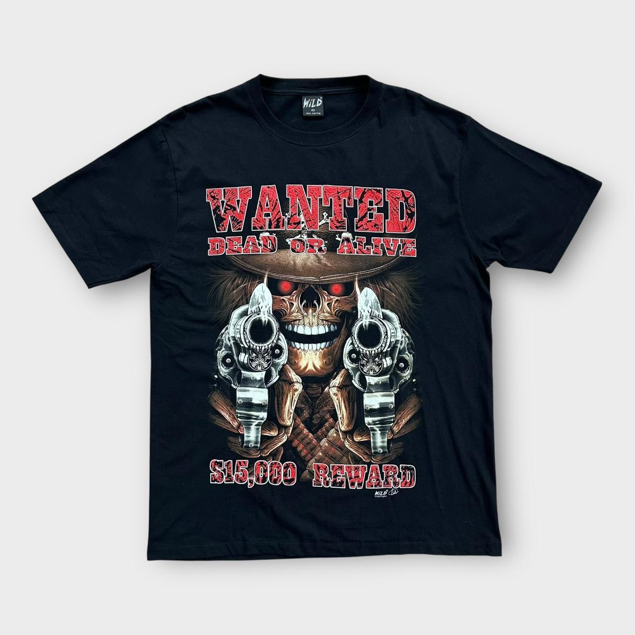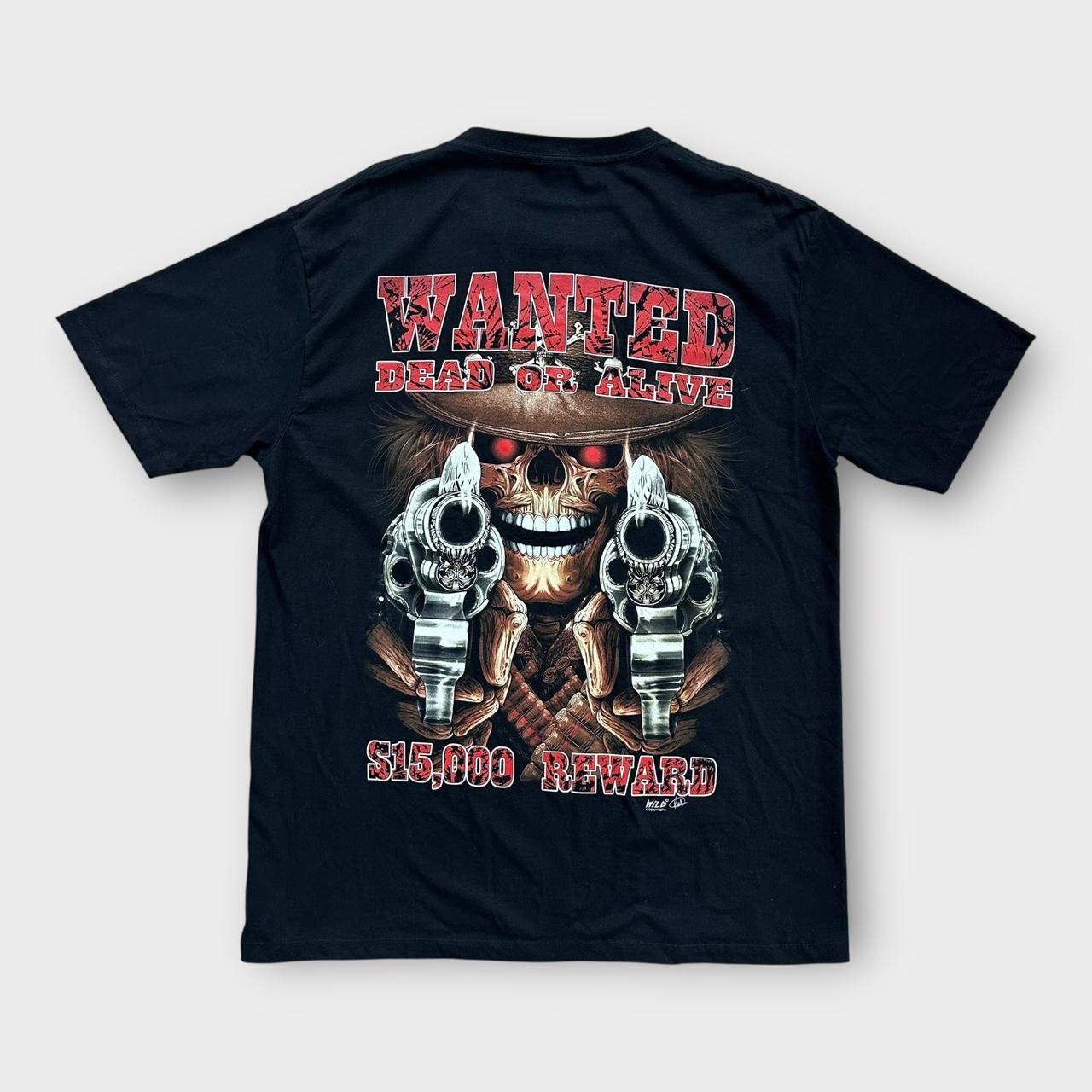 T-Shirt mit Totenkopfgrafik aus den frühen 2000ern „Wanted dead or alive“ mit Aufdruck auf der Brust und auf dem Rücken mit einem wilden Etikett. Hat auch Metalldetails auf der Vorderseite